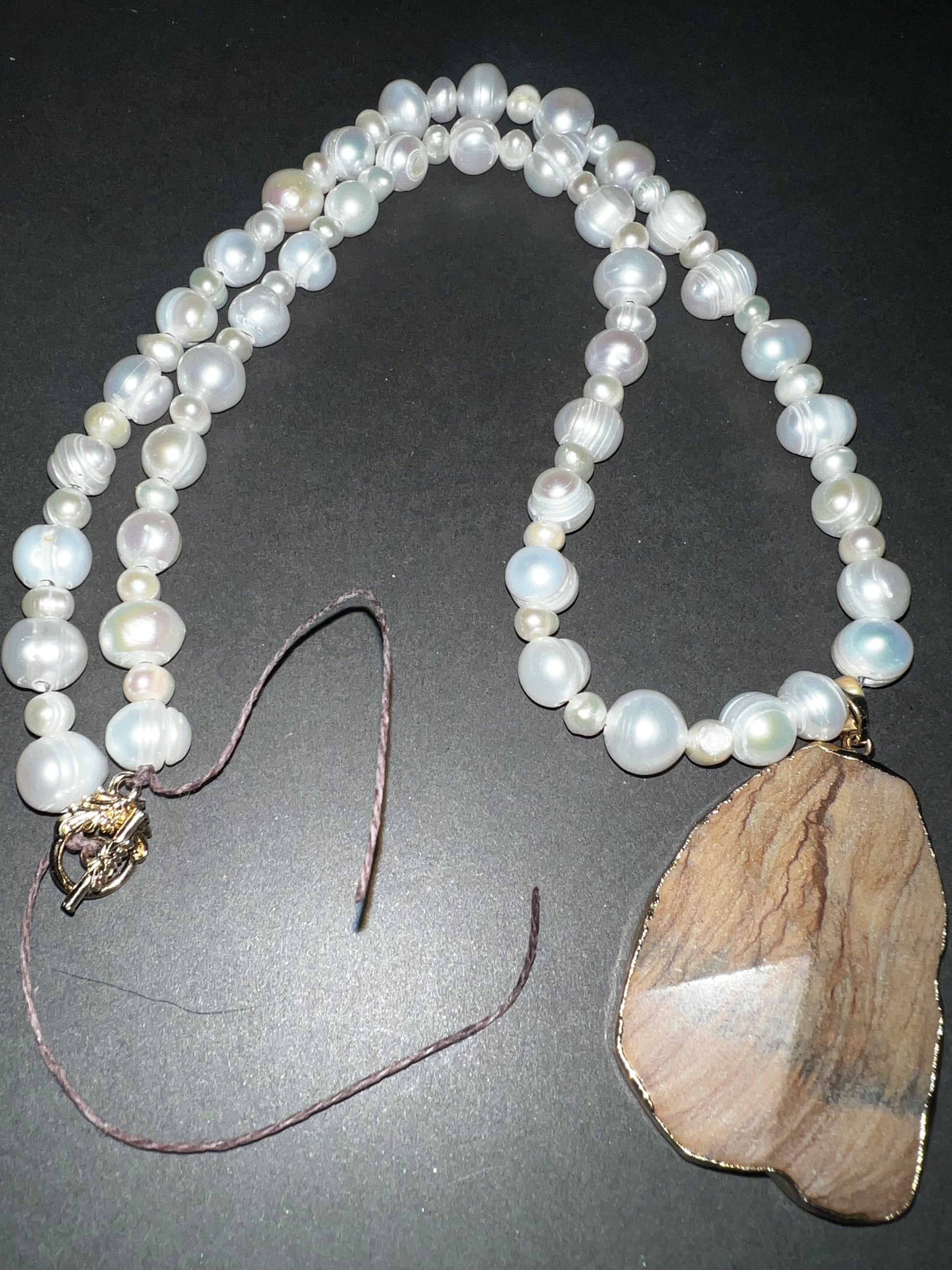 Real pearls with wood pendant on cord. Necklace does have a clasp. String attached for extra knots if preferred, cut when satisfied. A recent trip to Hawaii inspired this piece. Approximately 14” in length (includes pendant).