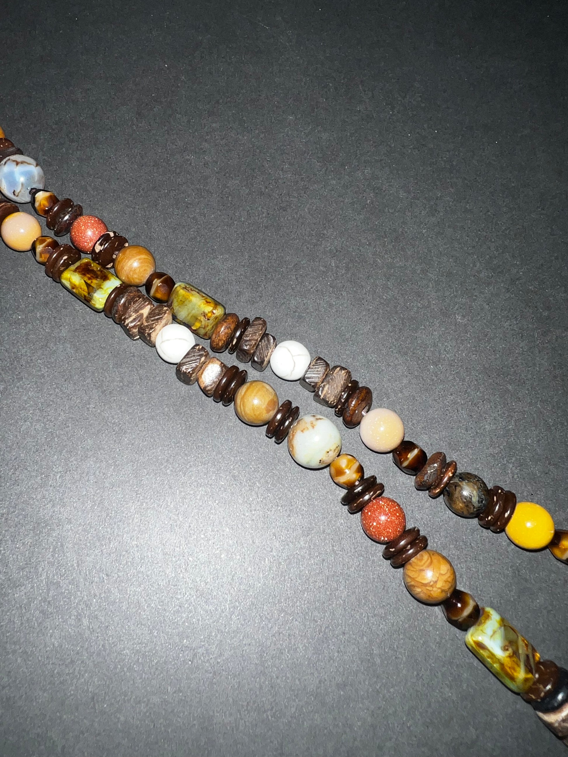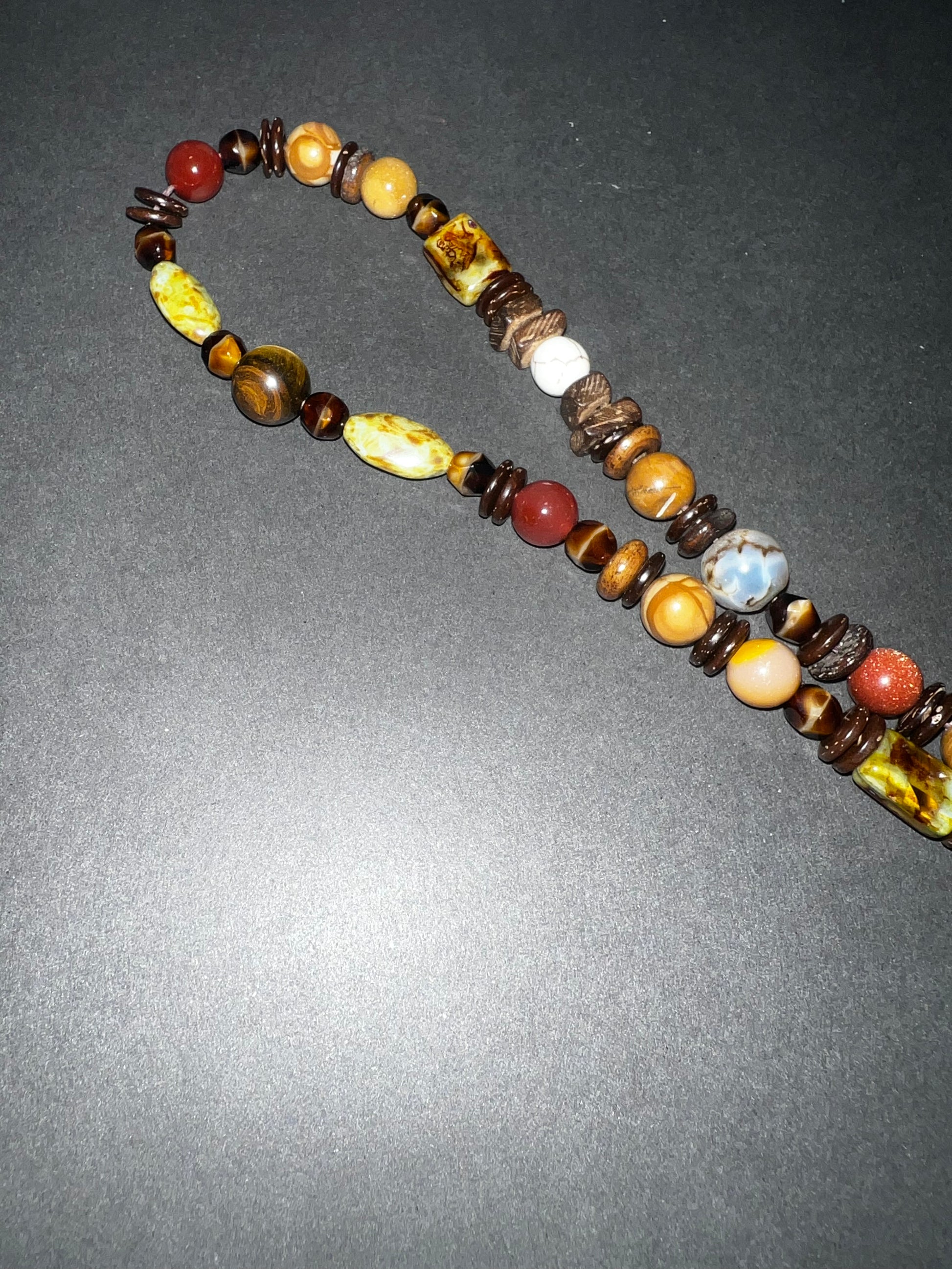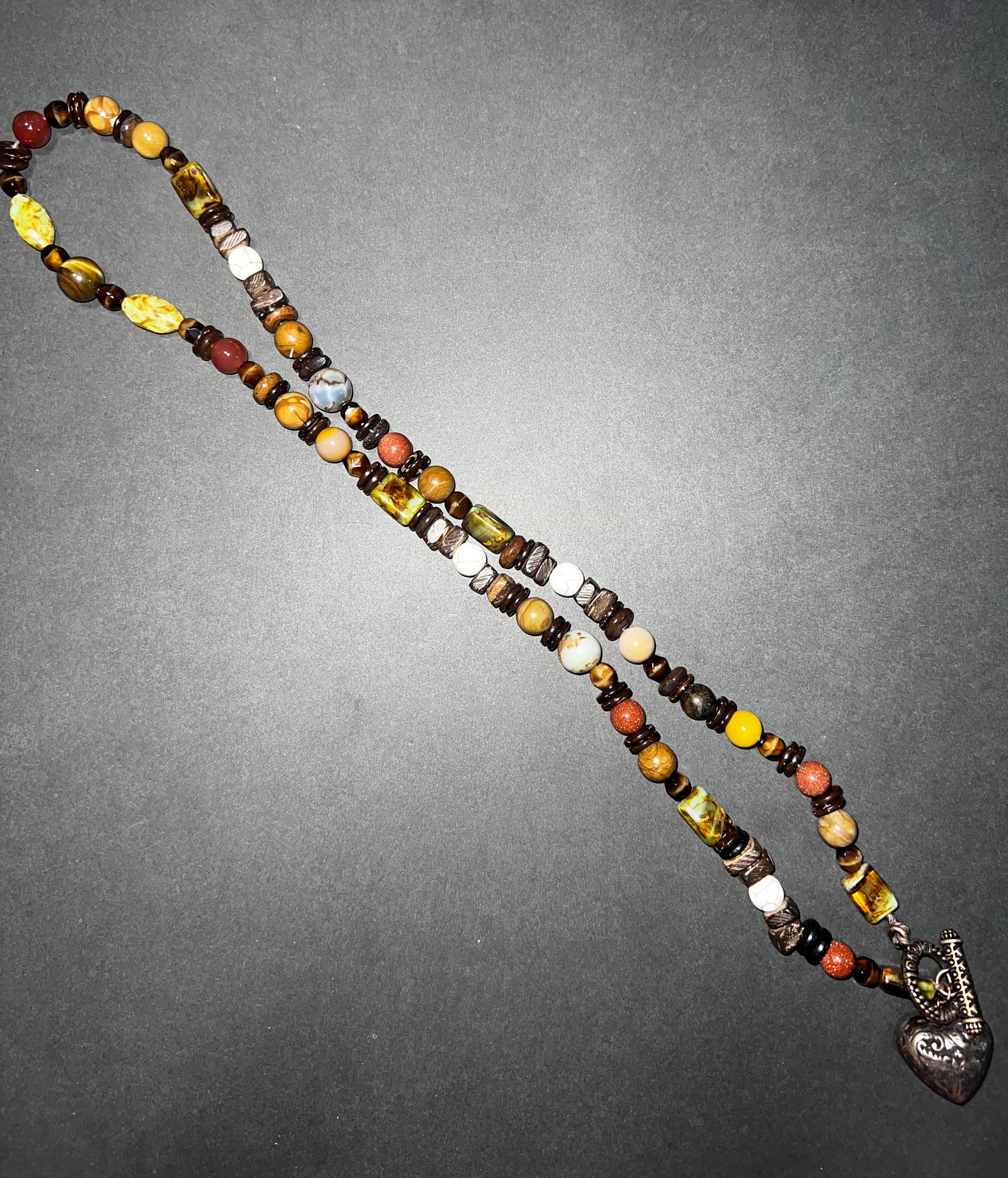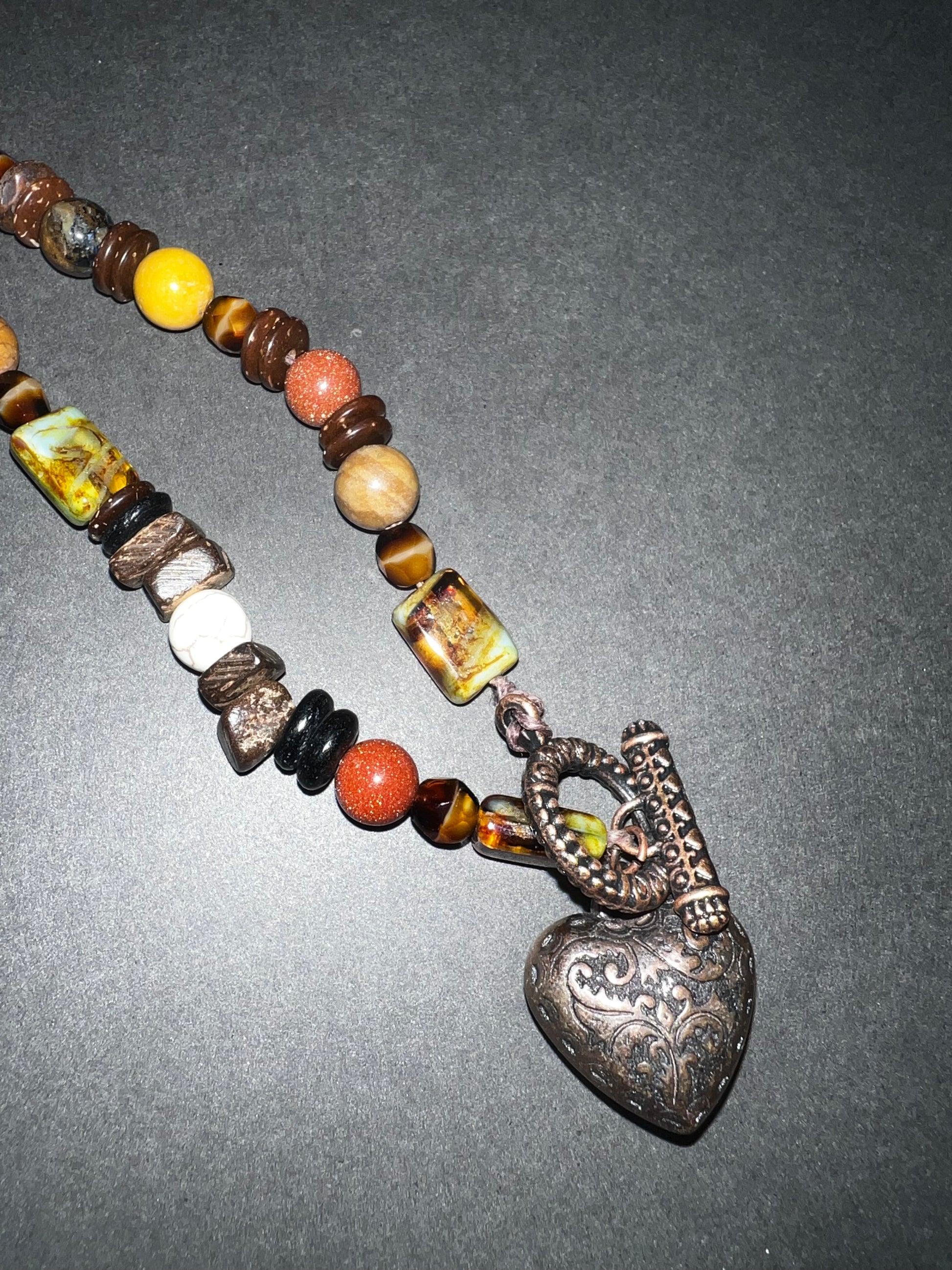 This necklace or wrap bracelet (wrap up to 3 times) is made with wood, carnelian, tigers eye, wood jasper, white howlite, moonstone, agate and glass. Bronze heart charm with clasp.