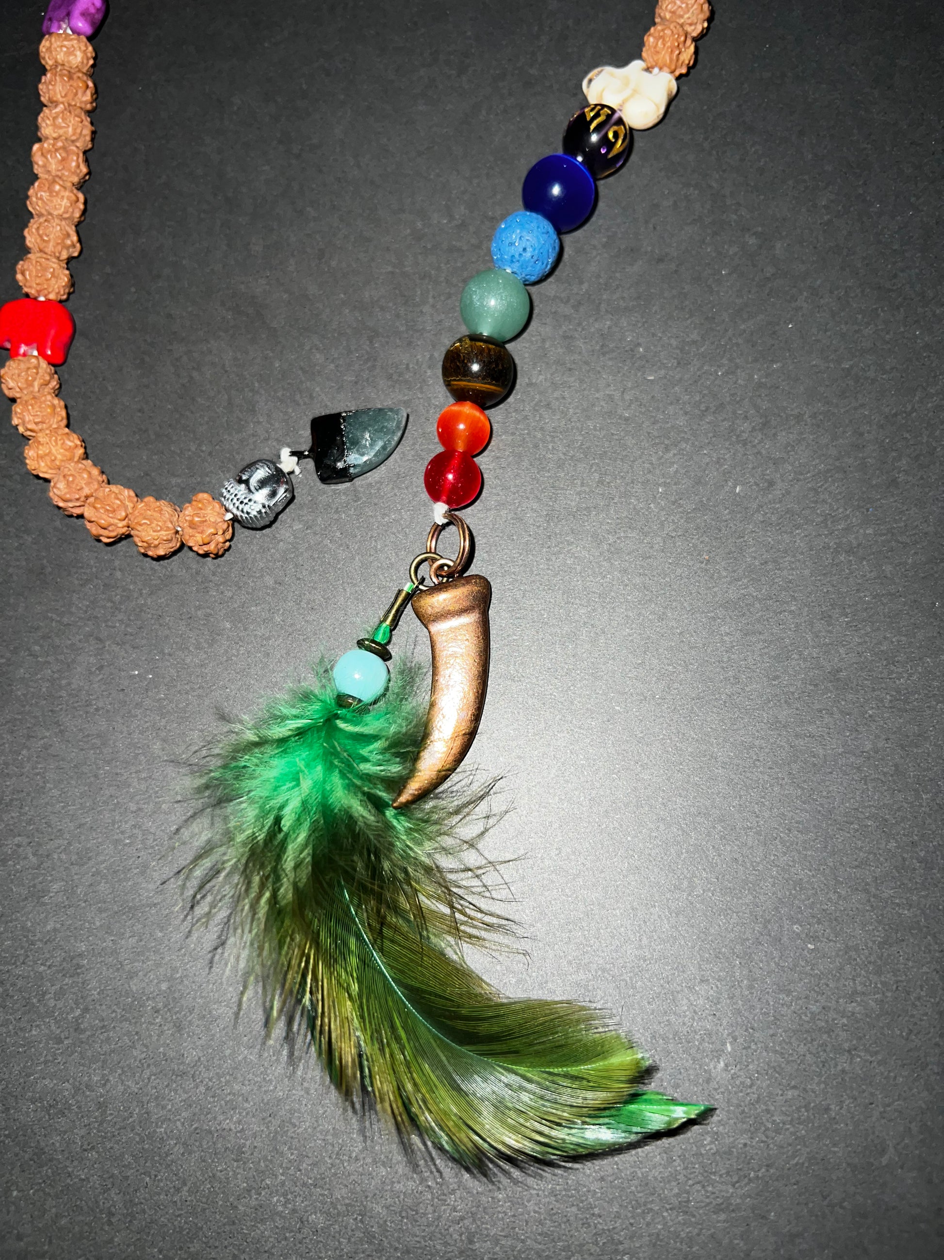 Red and orange glass, Tigers eye, adventurine, lava bead, cats eye, elephant magnesite, and Bodhi beads. Decorated with green feather, houndstooth, Buddha head, elephants and unknown blue stone.