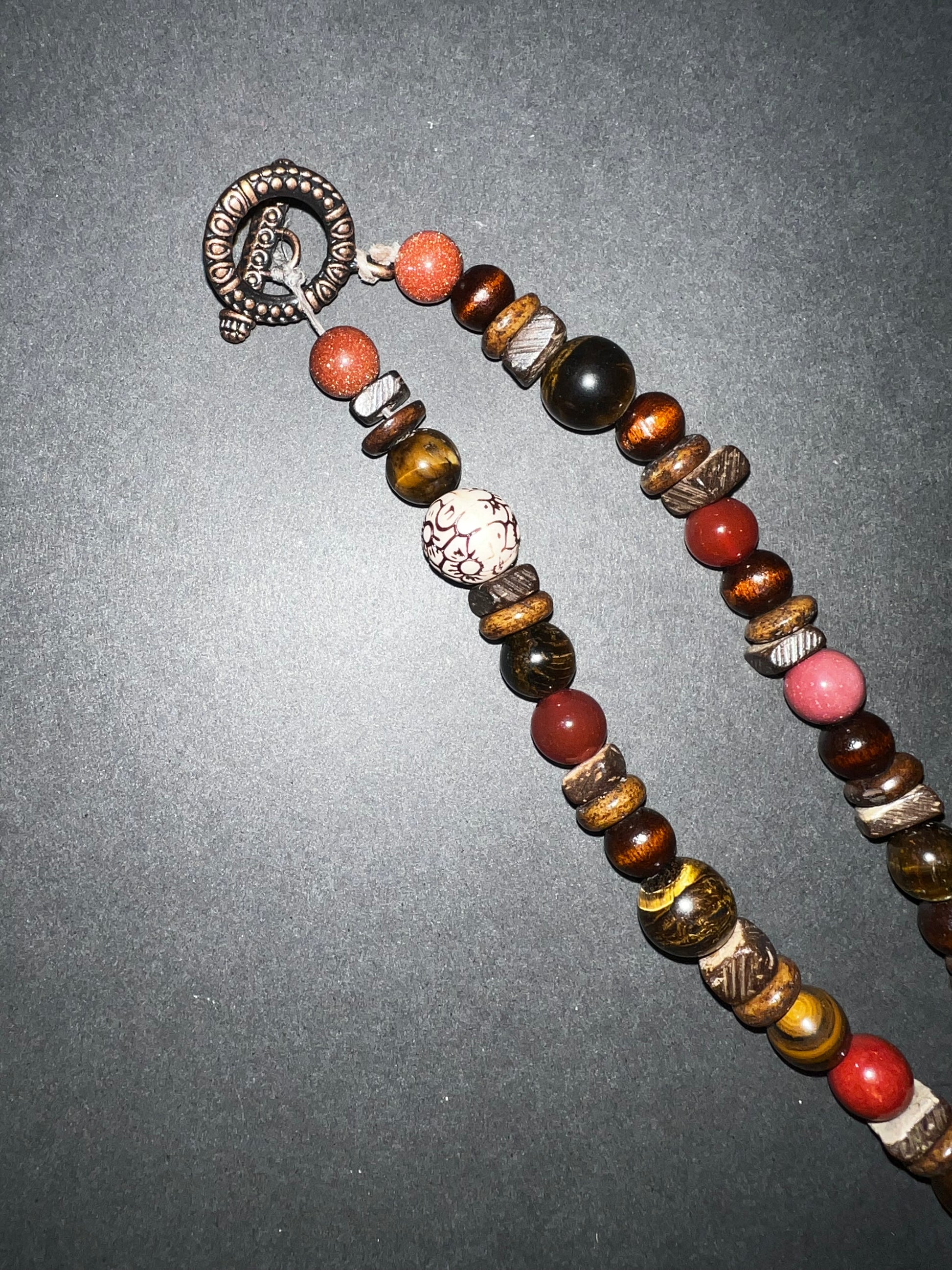 This necklace or wrap bracelet (wrap up to 3 times) is made with wood, carnelian, tigers eye, wood jasper, white howlite, moonstone, jasper, and floral beads.