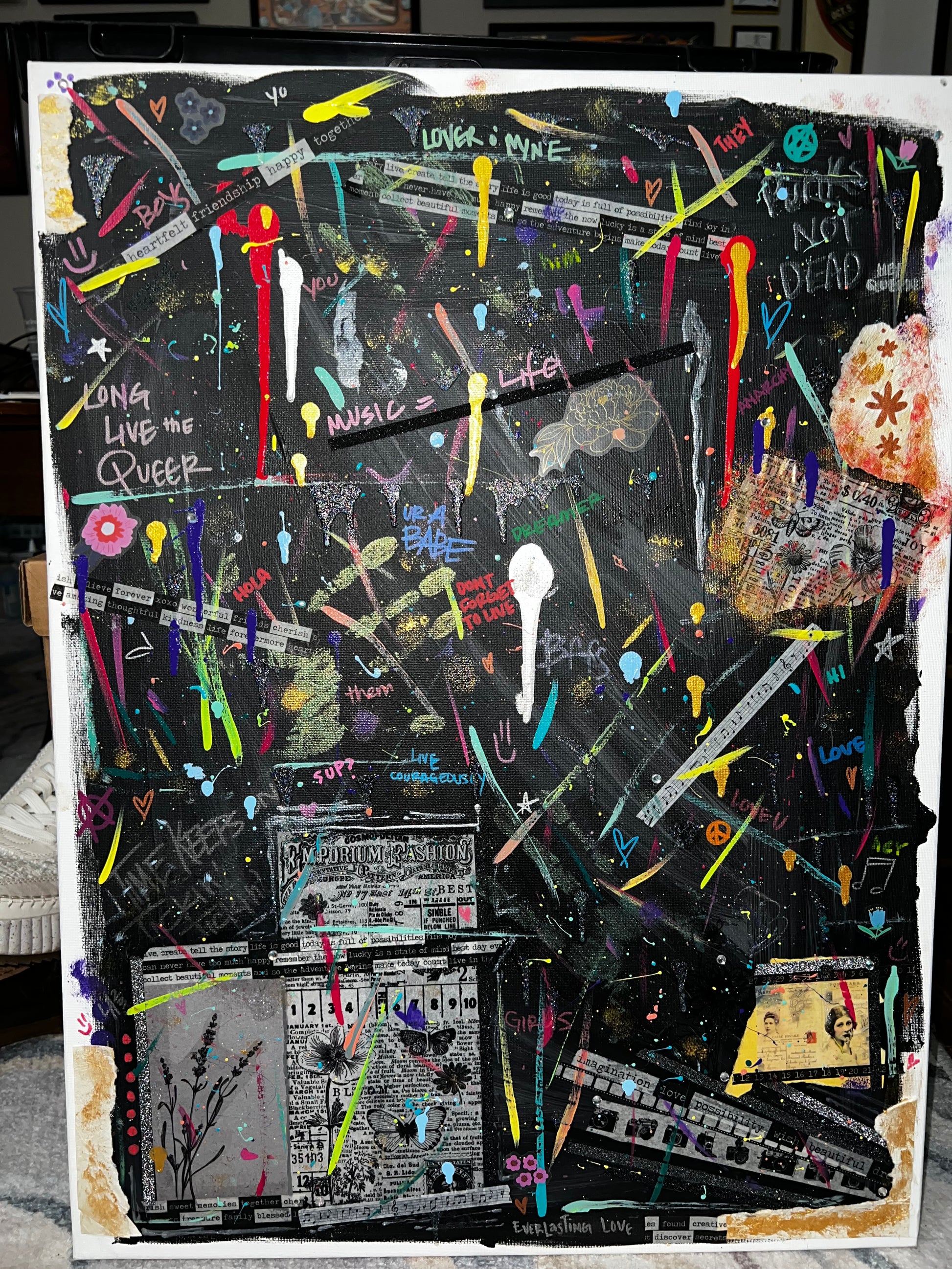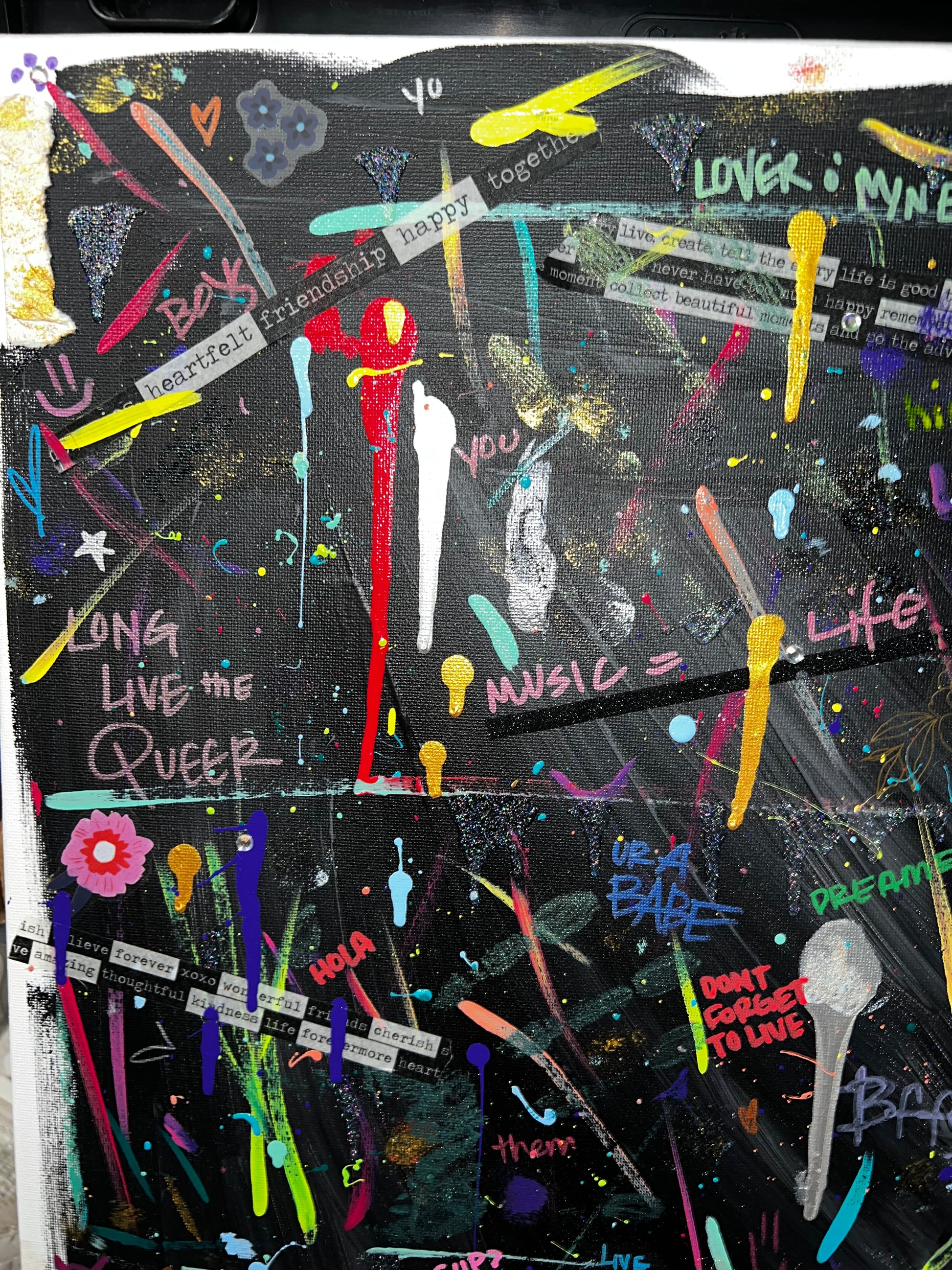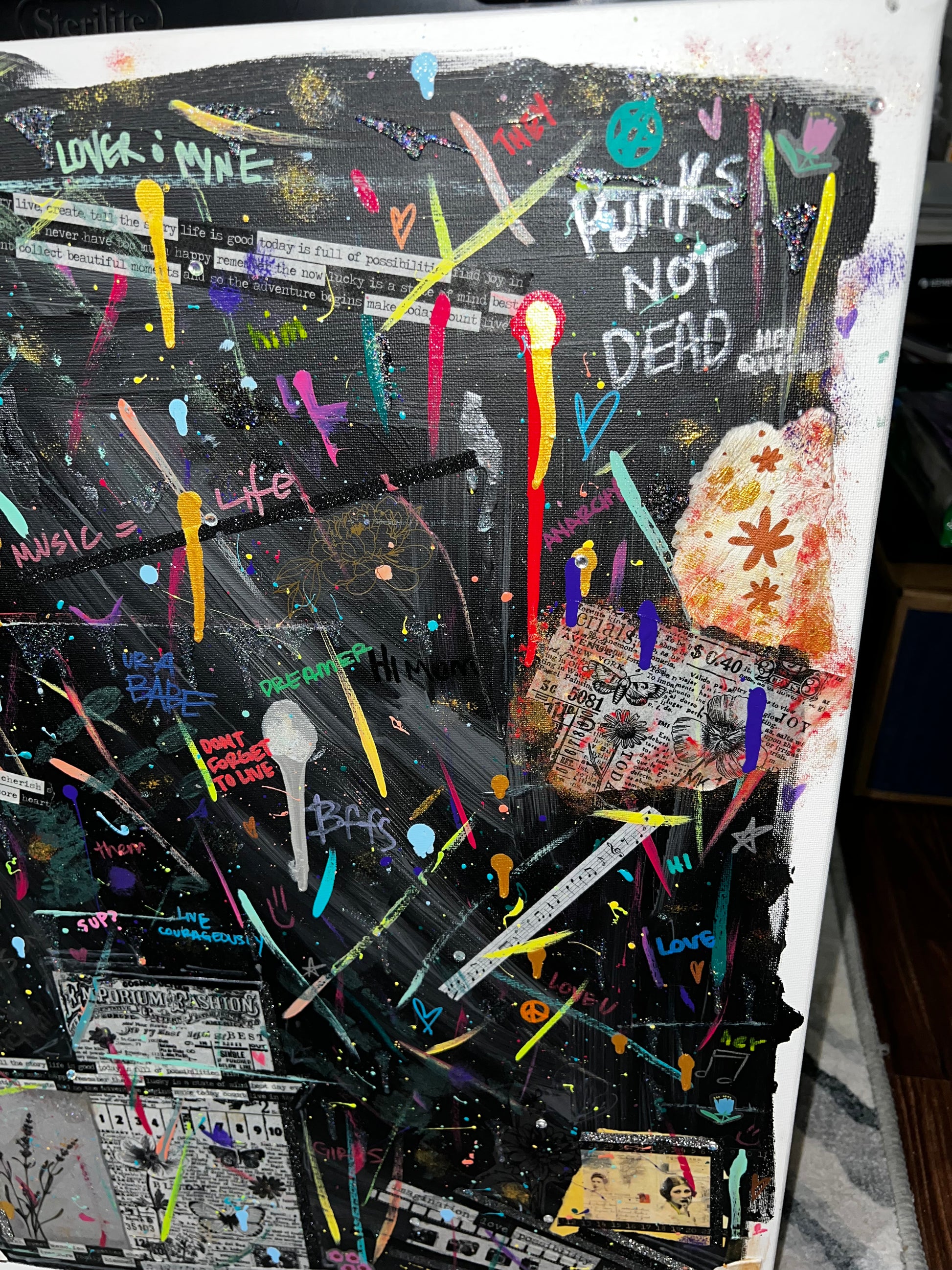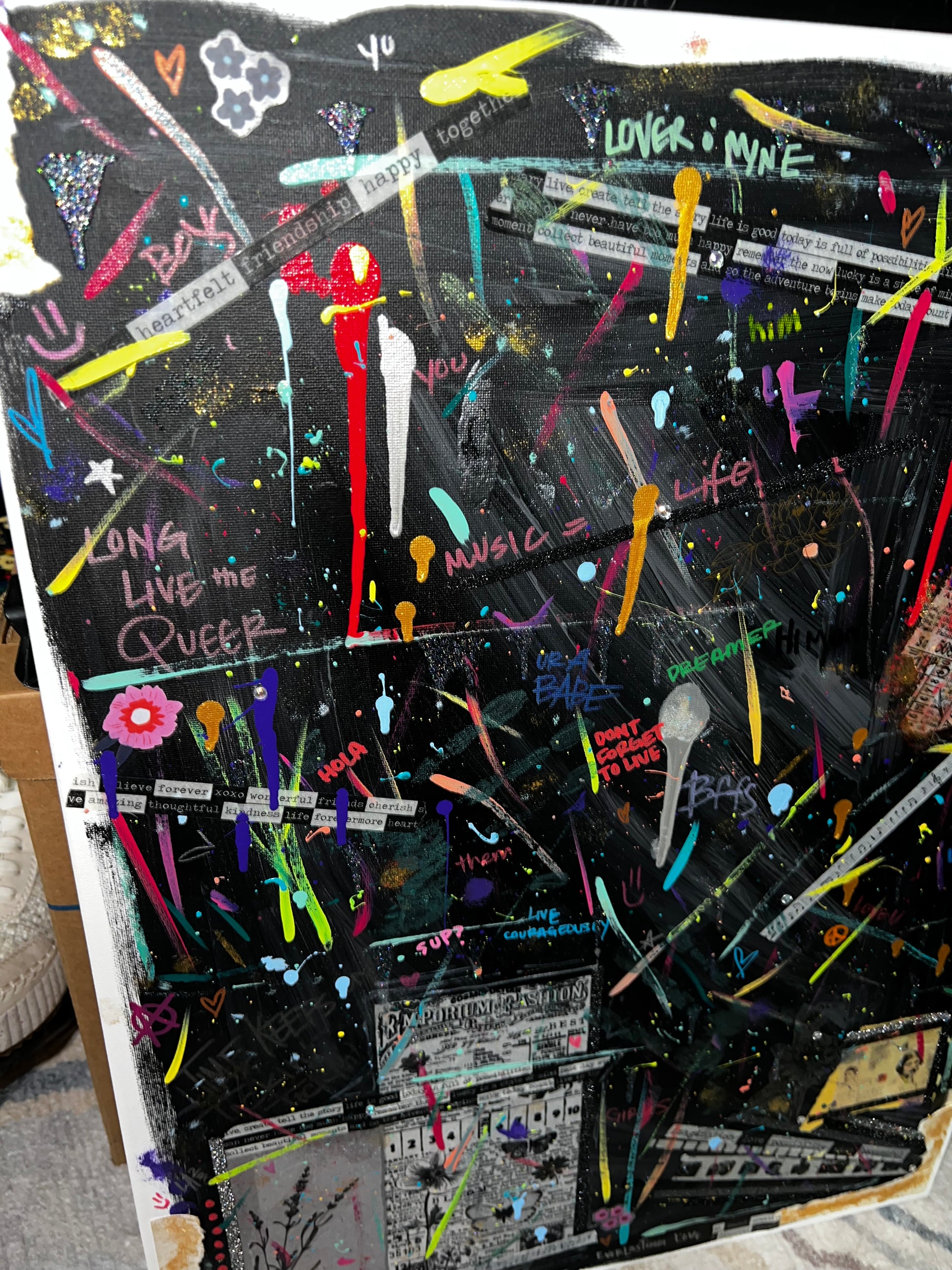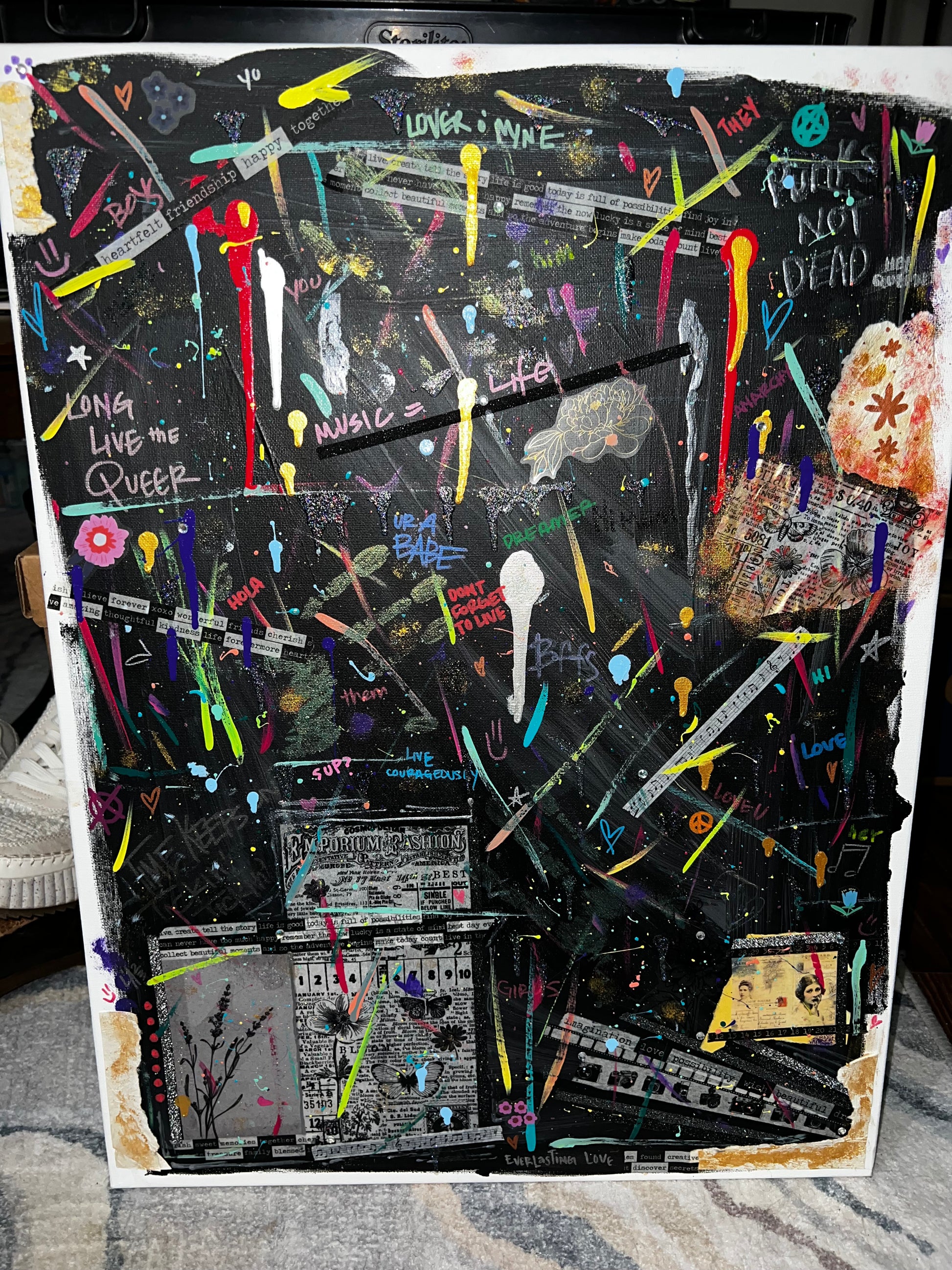 mixed media: acrylic paints, paper, glitter, stickers, and more!