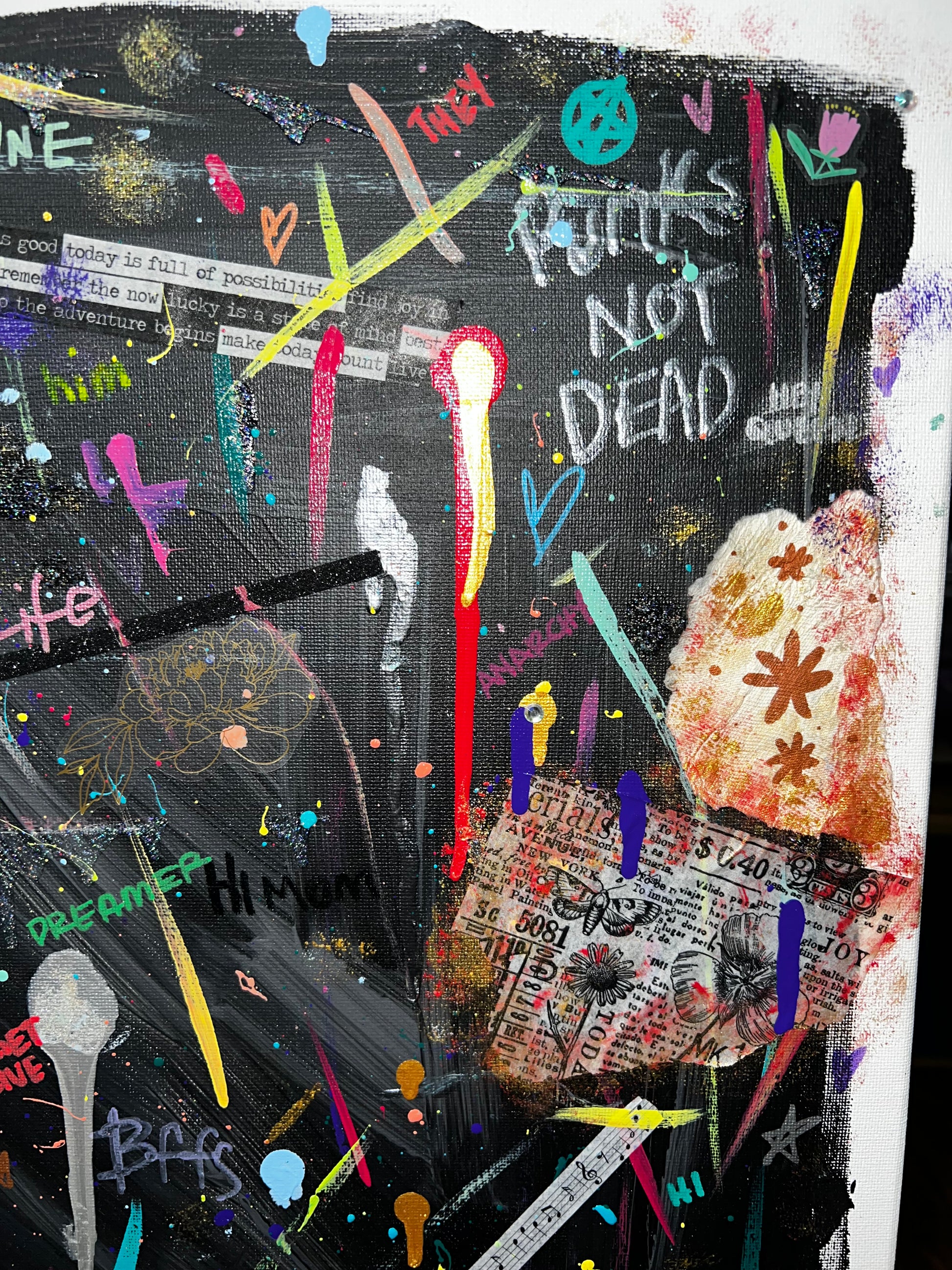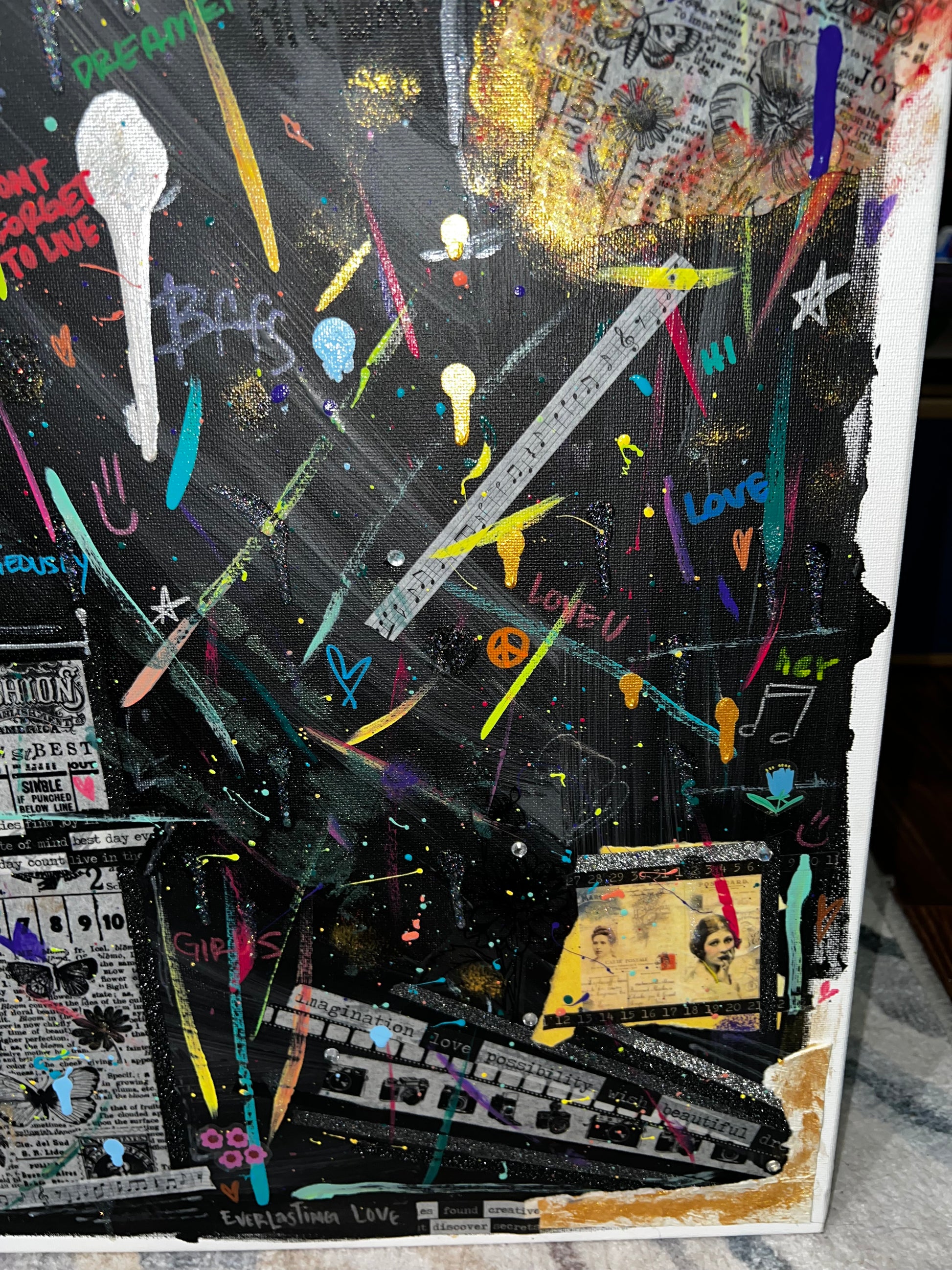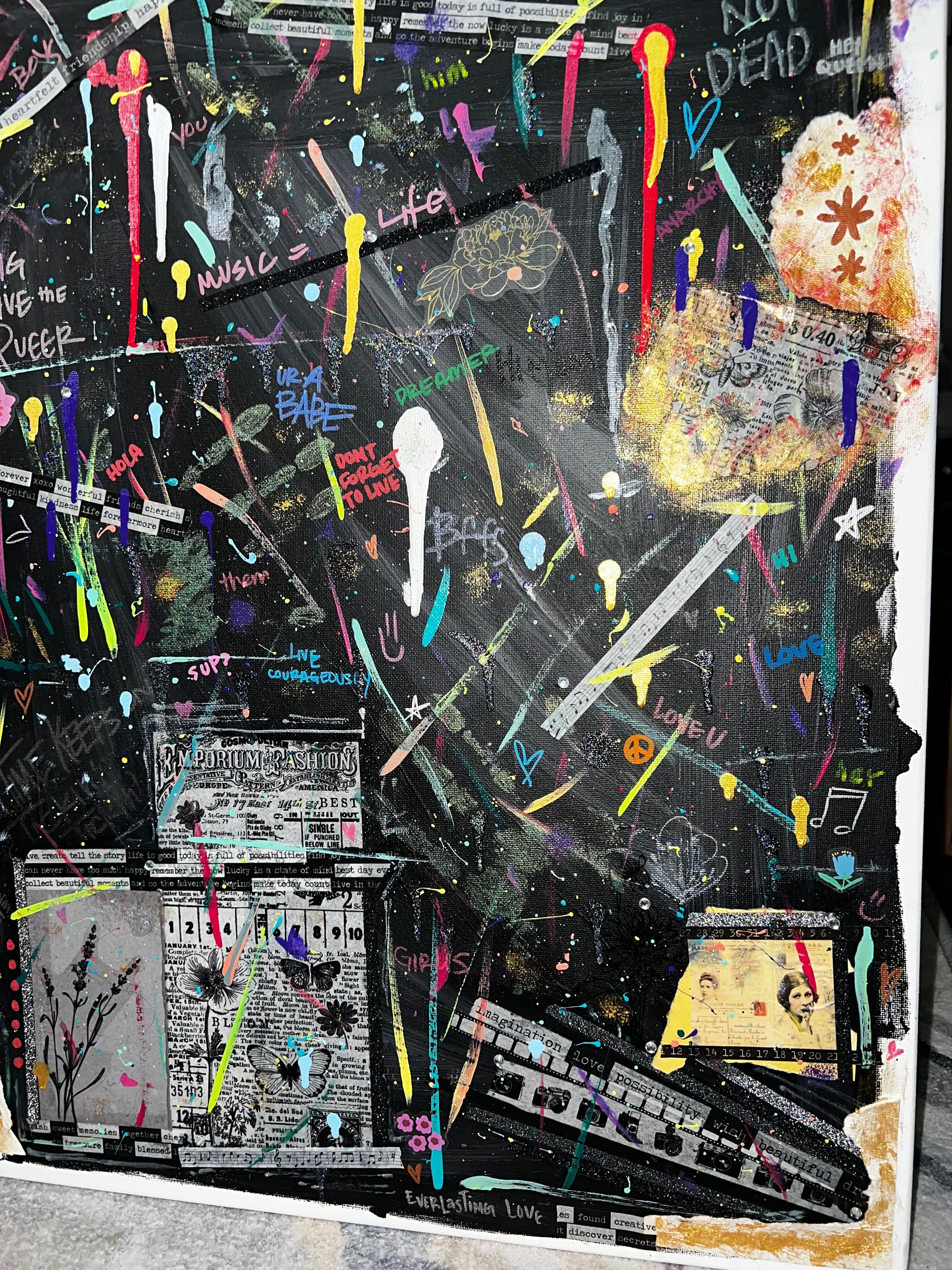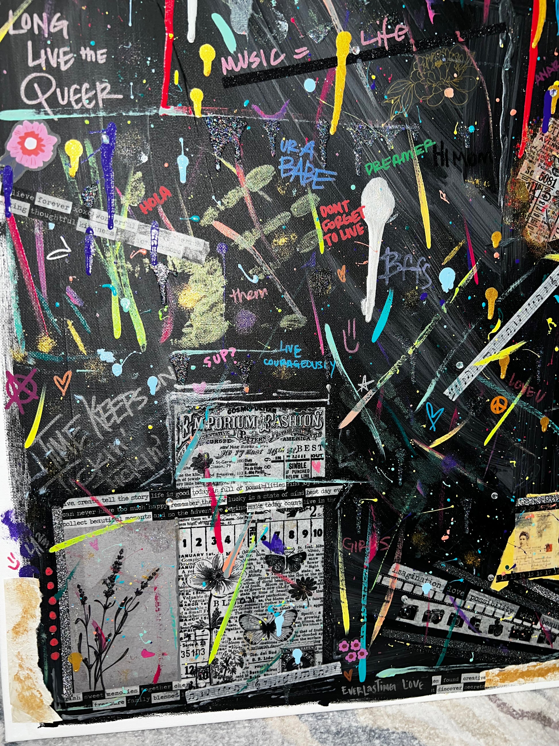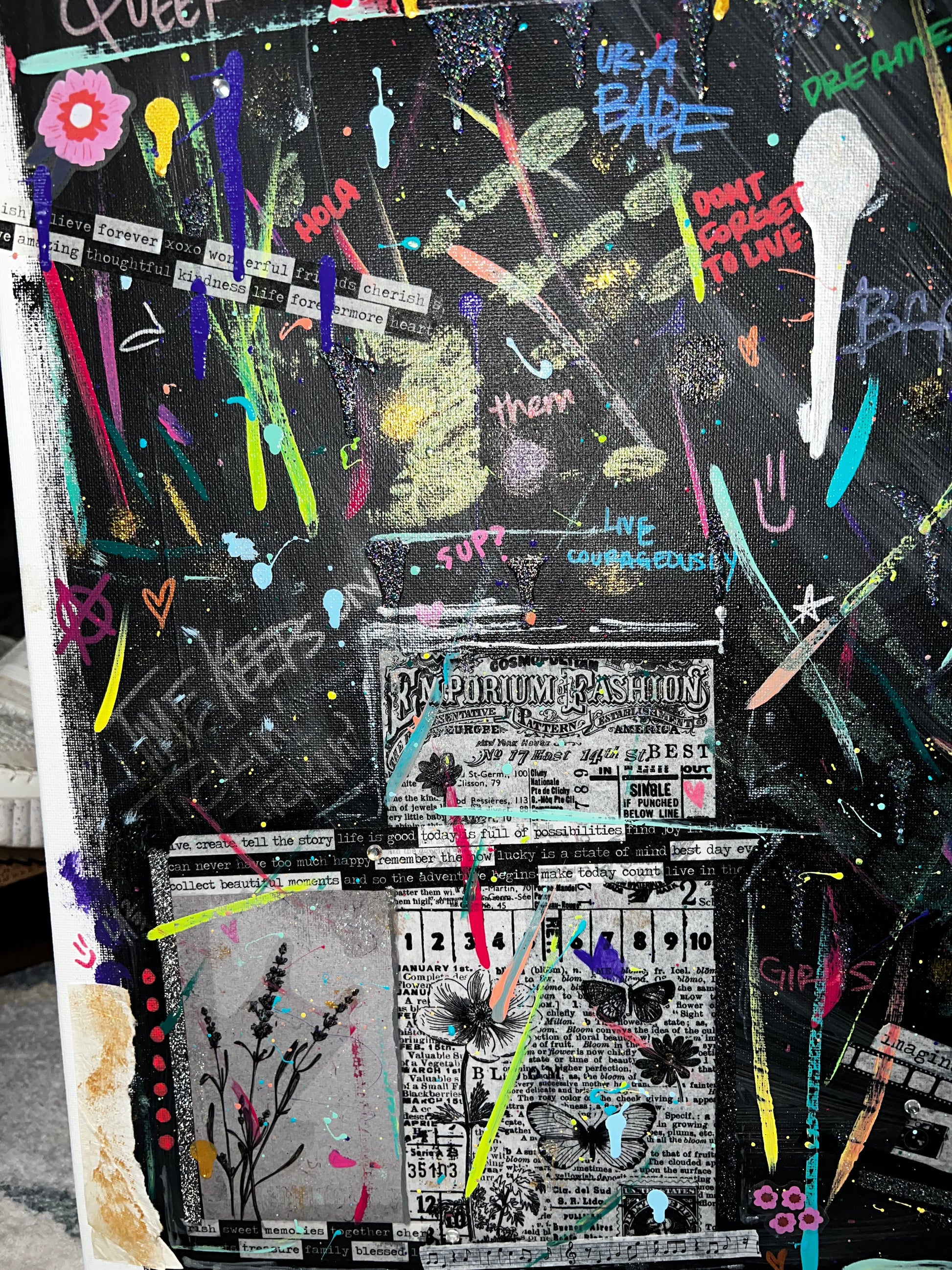 mixed media: acrylic paints, paper, glitter, stickers, and more!