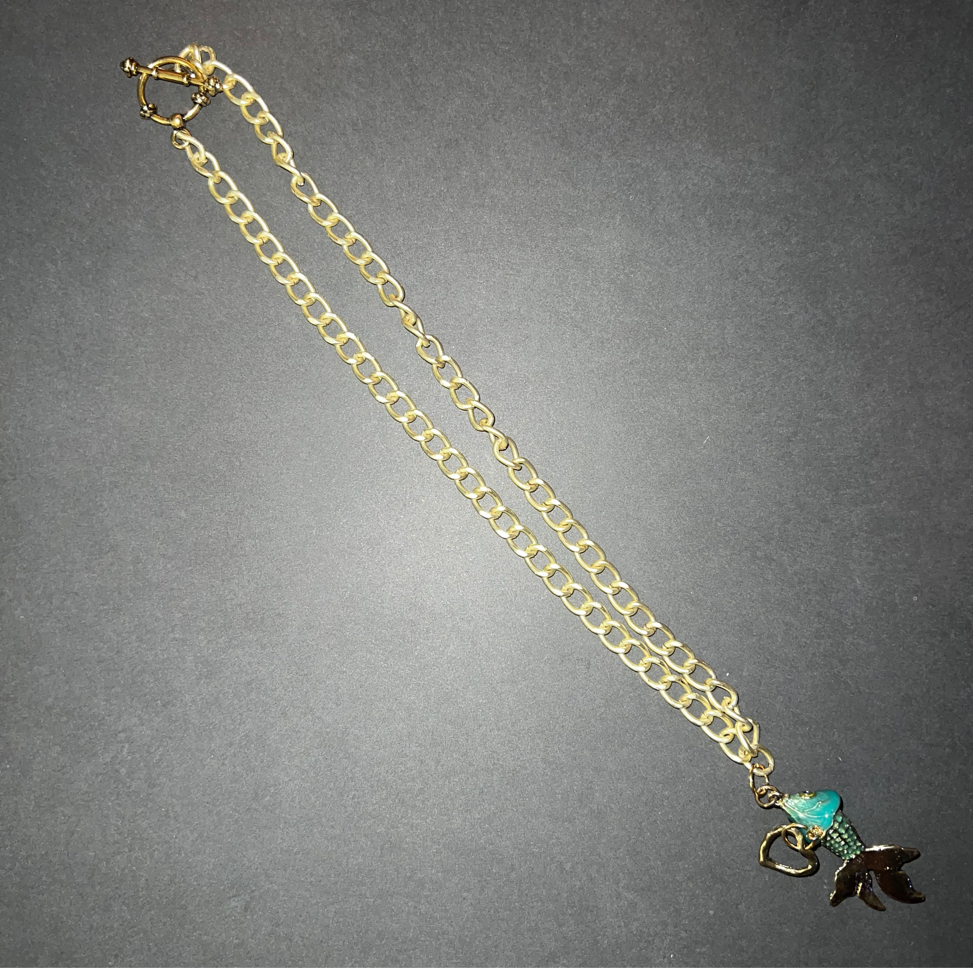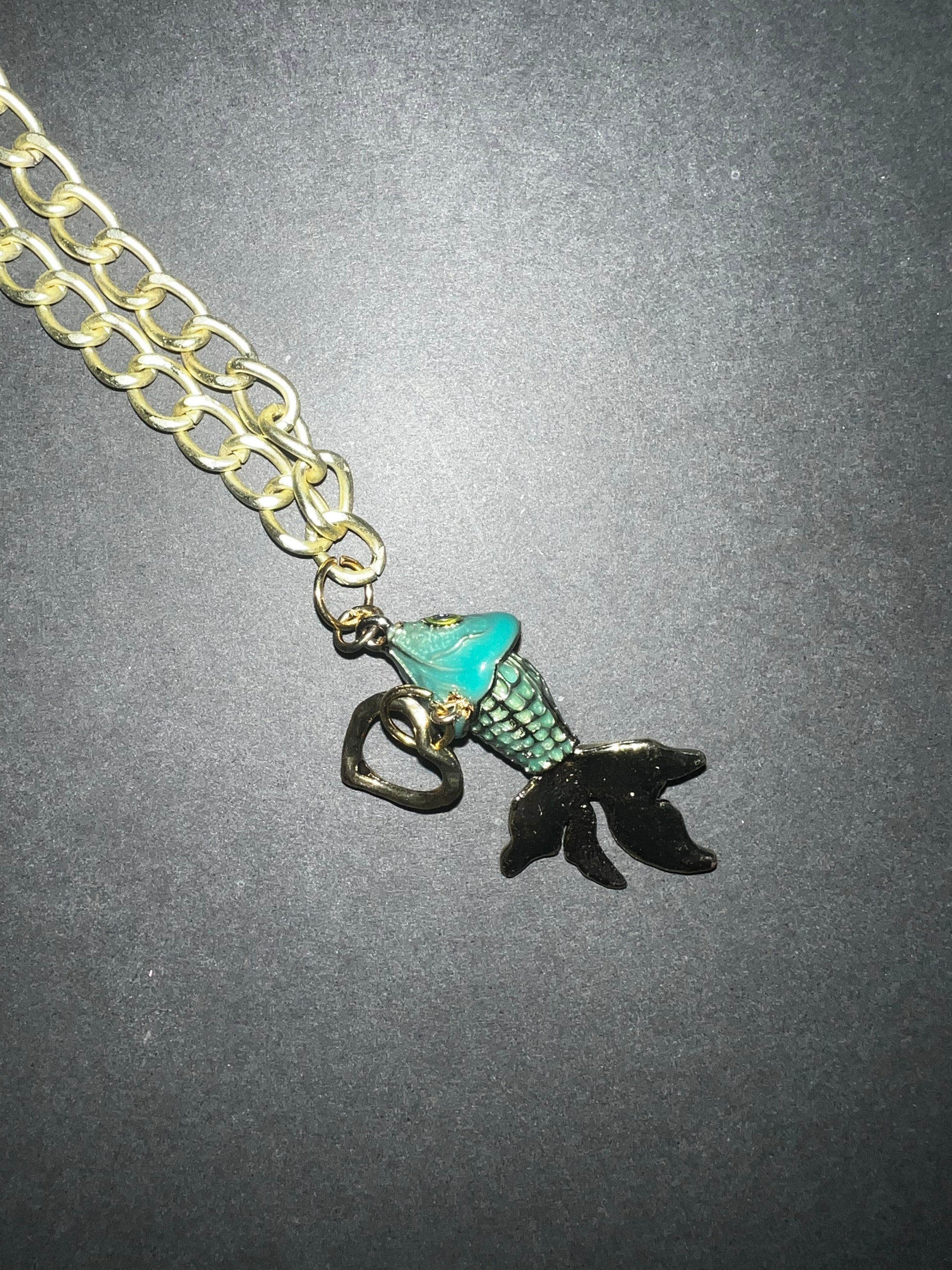 8” faux gold link chain with gold koi and heart charm. Koi charm moves, it’s super cute!