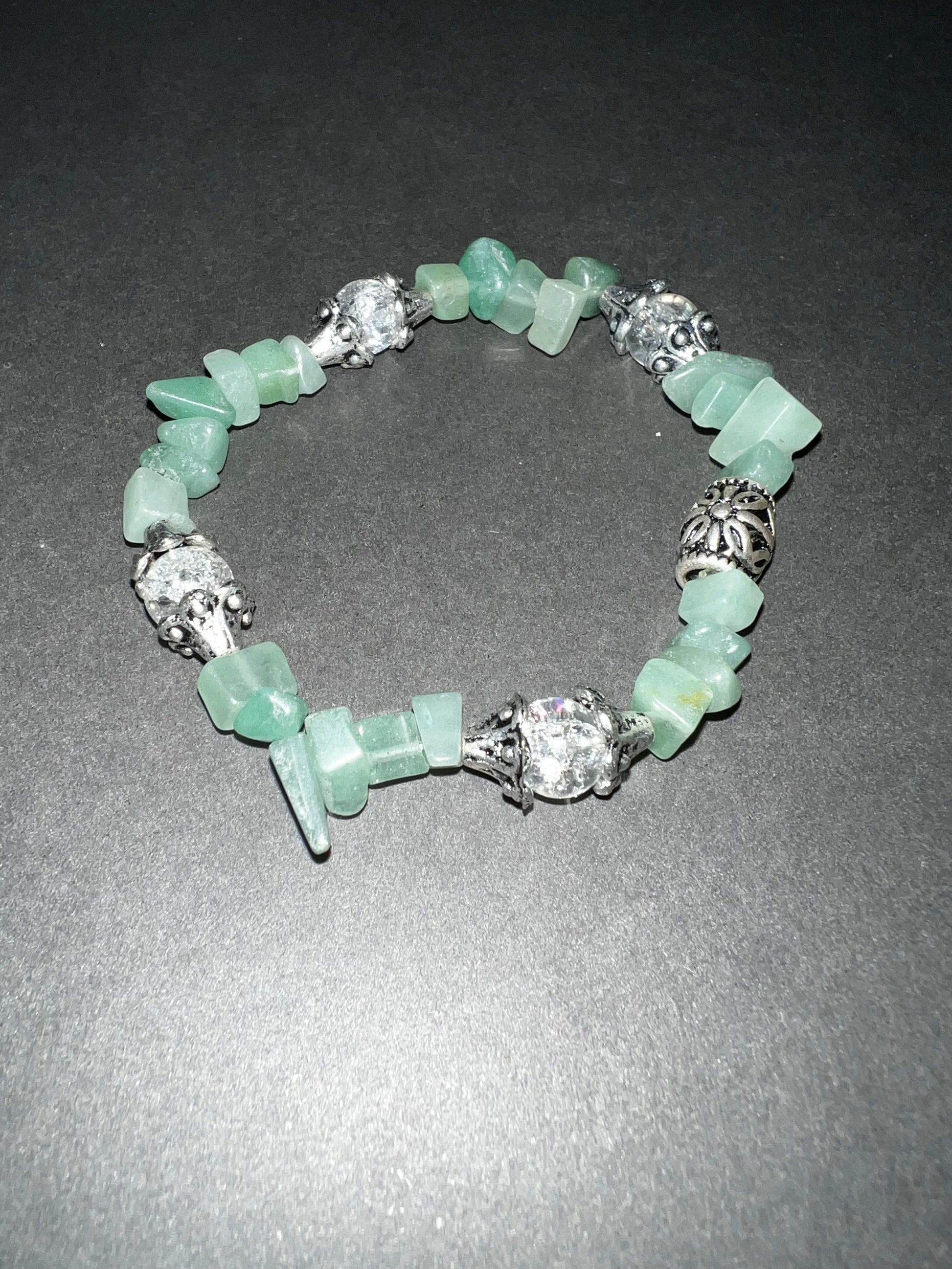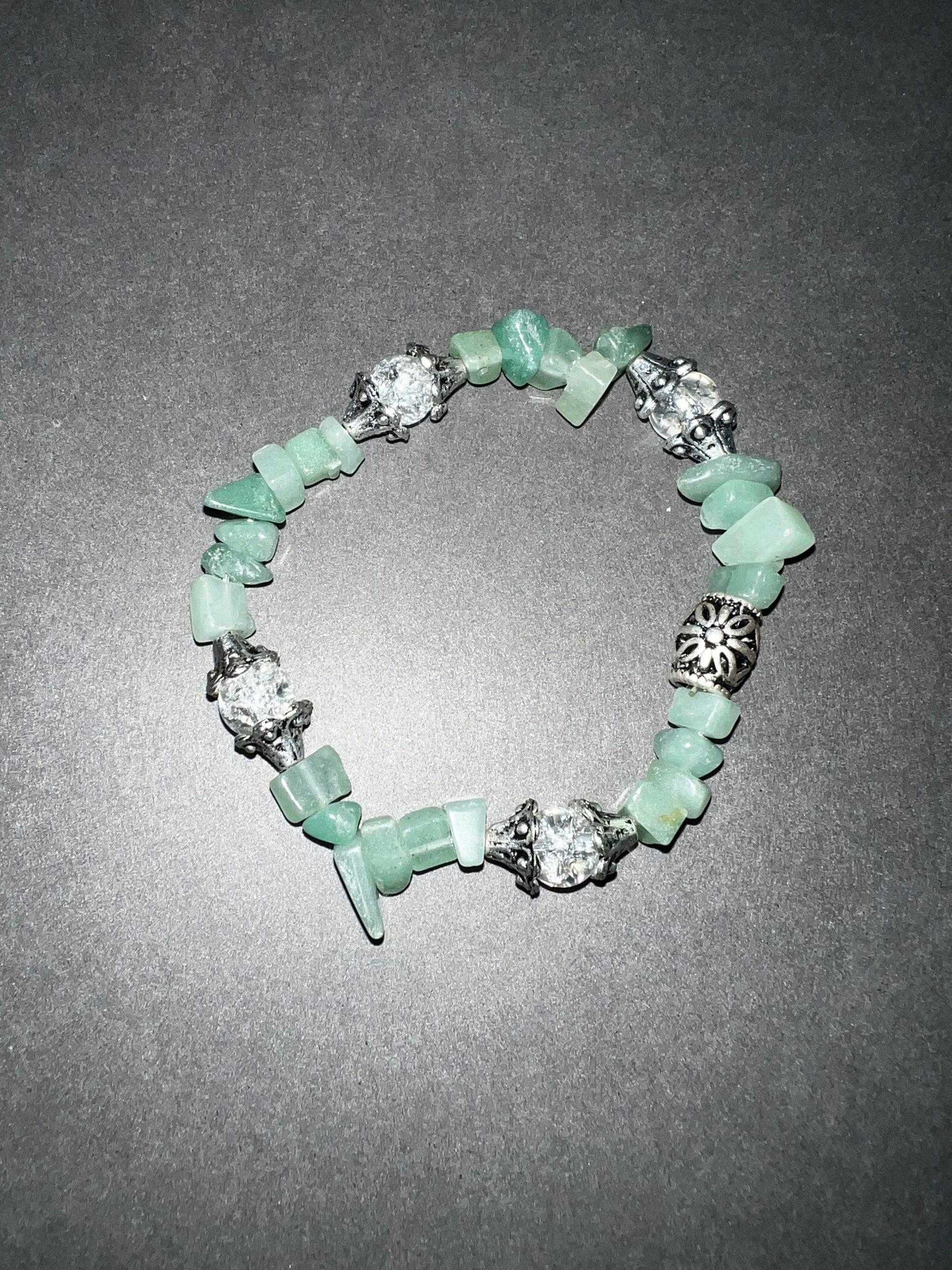 Made with jade chips with accents of silver and clear glass beads.