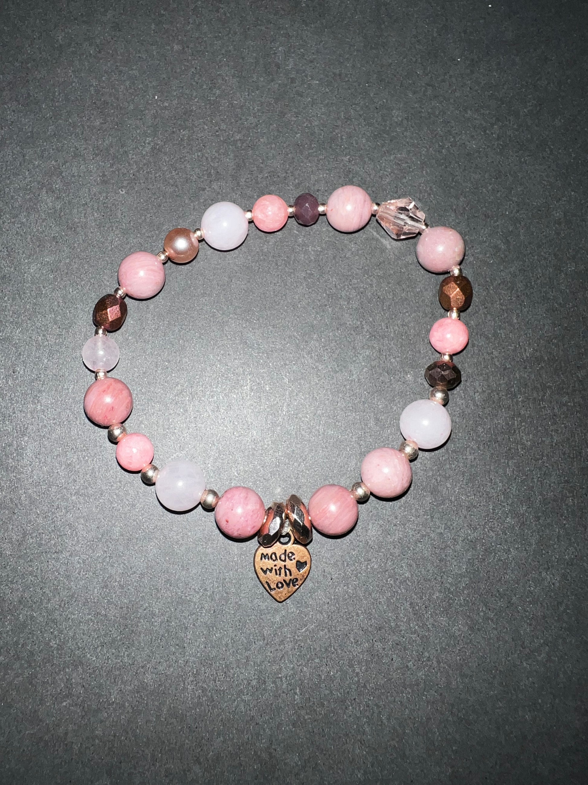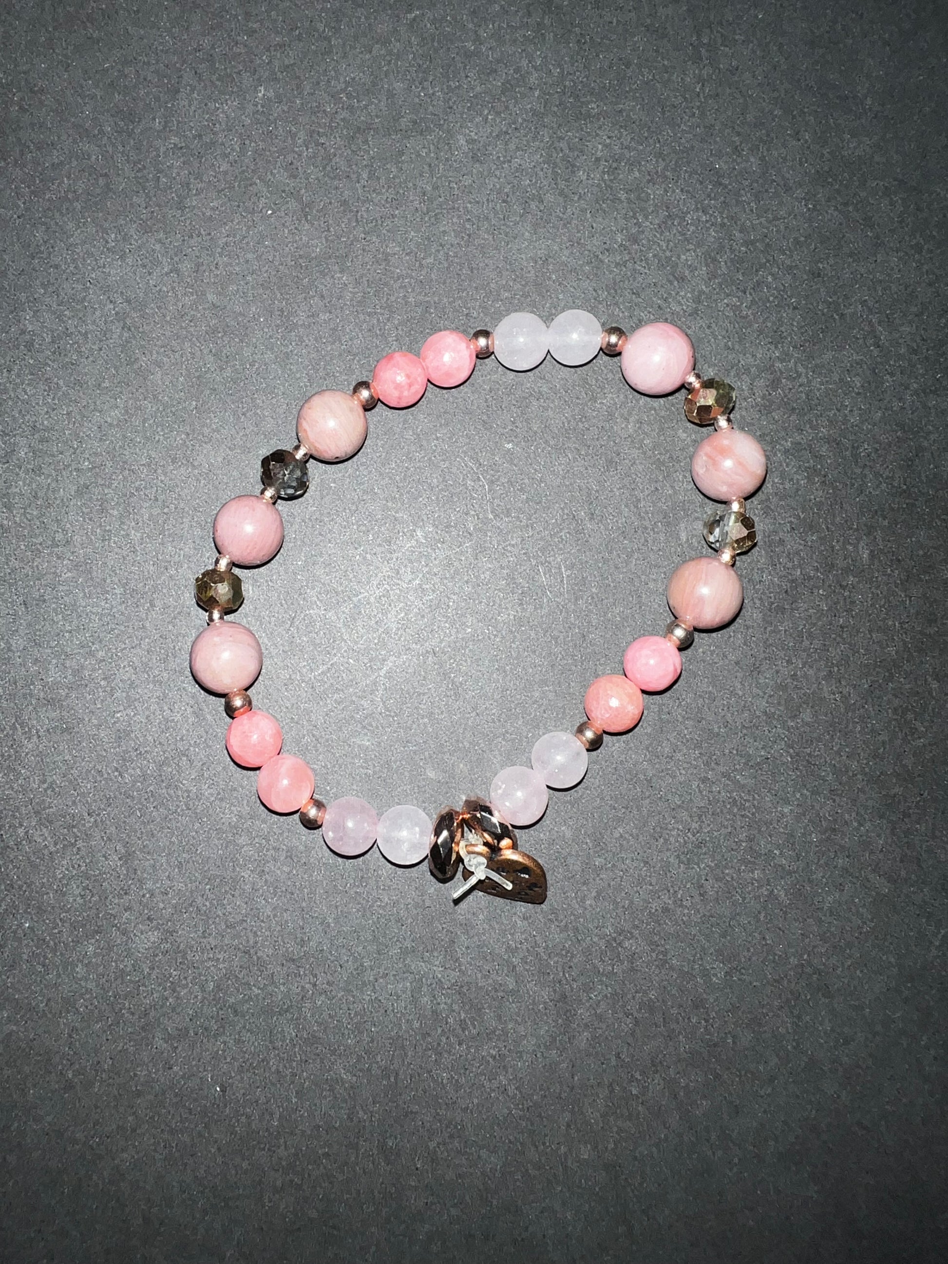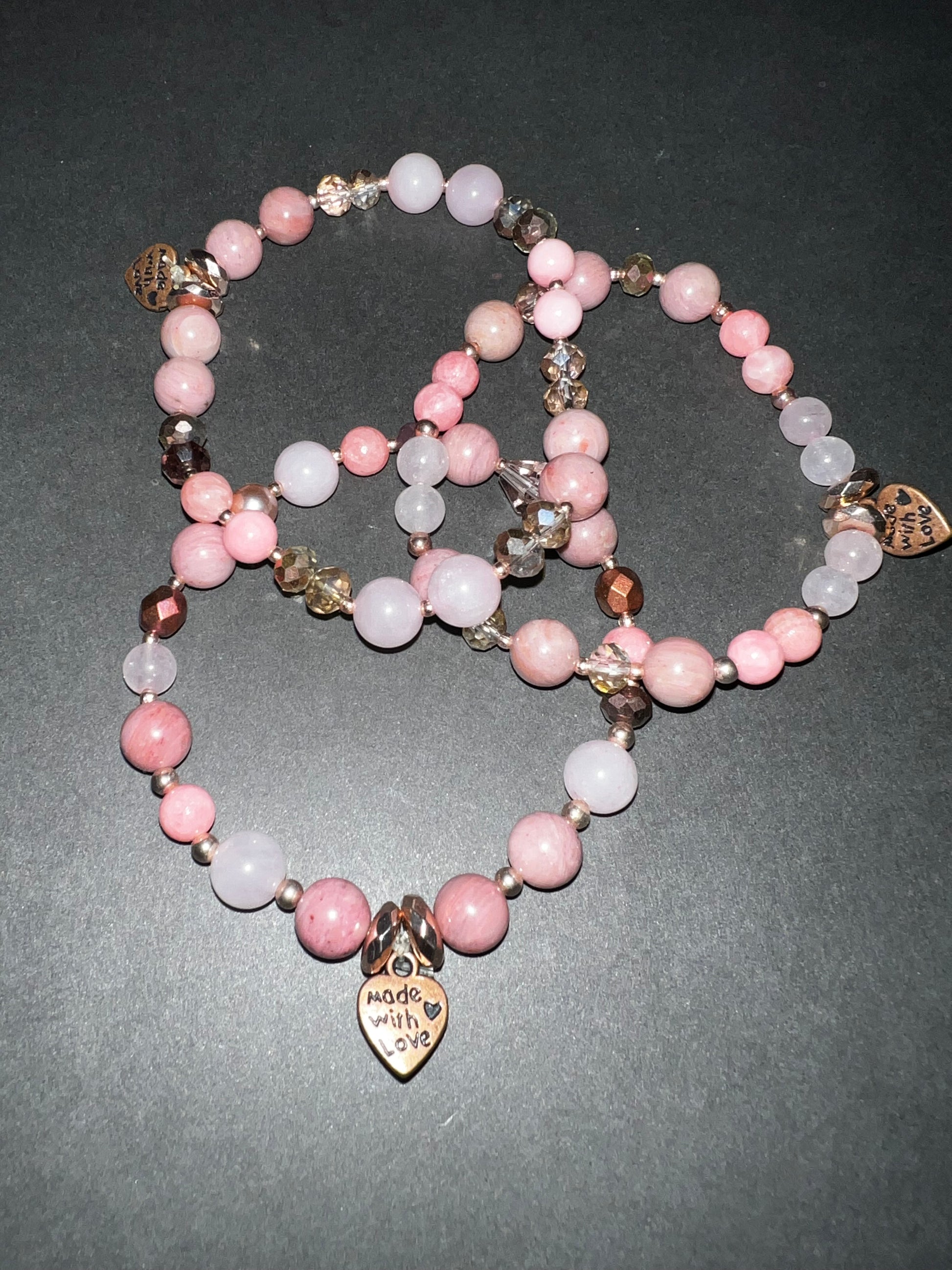 Pink & coral pink quartz, unikite, pink pearls, and pink multifaceted clear beads with rose gold accents pieces. Set of 3.