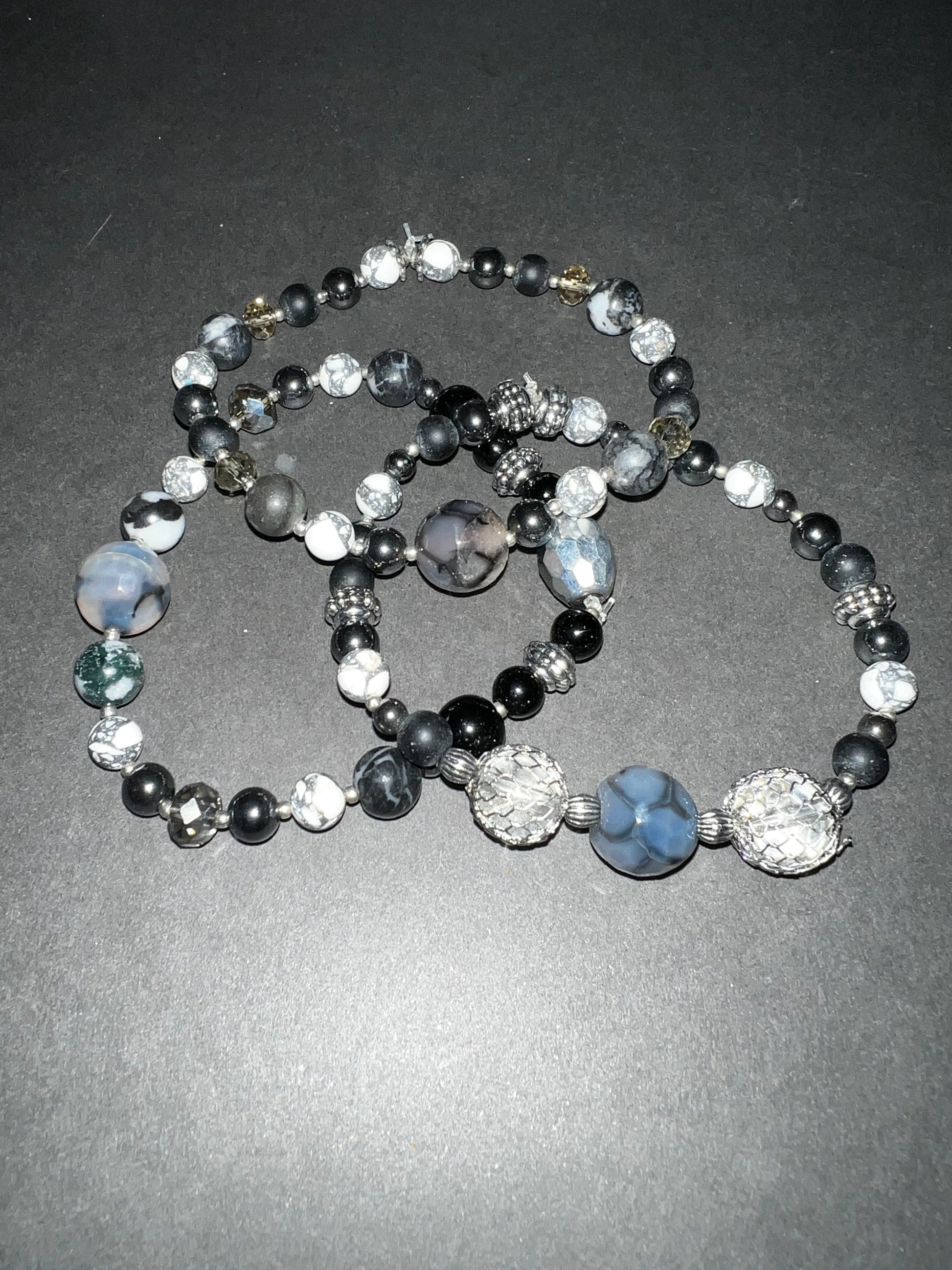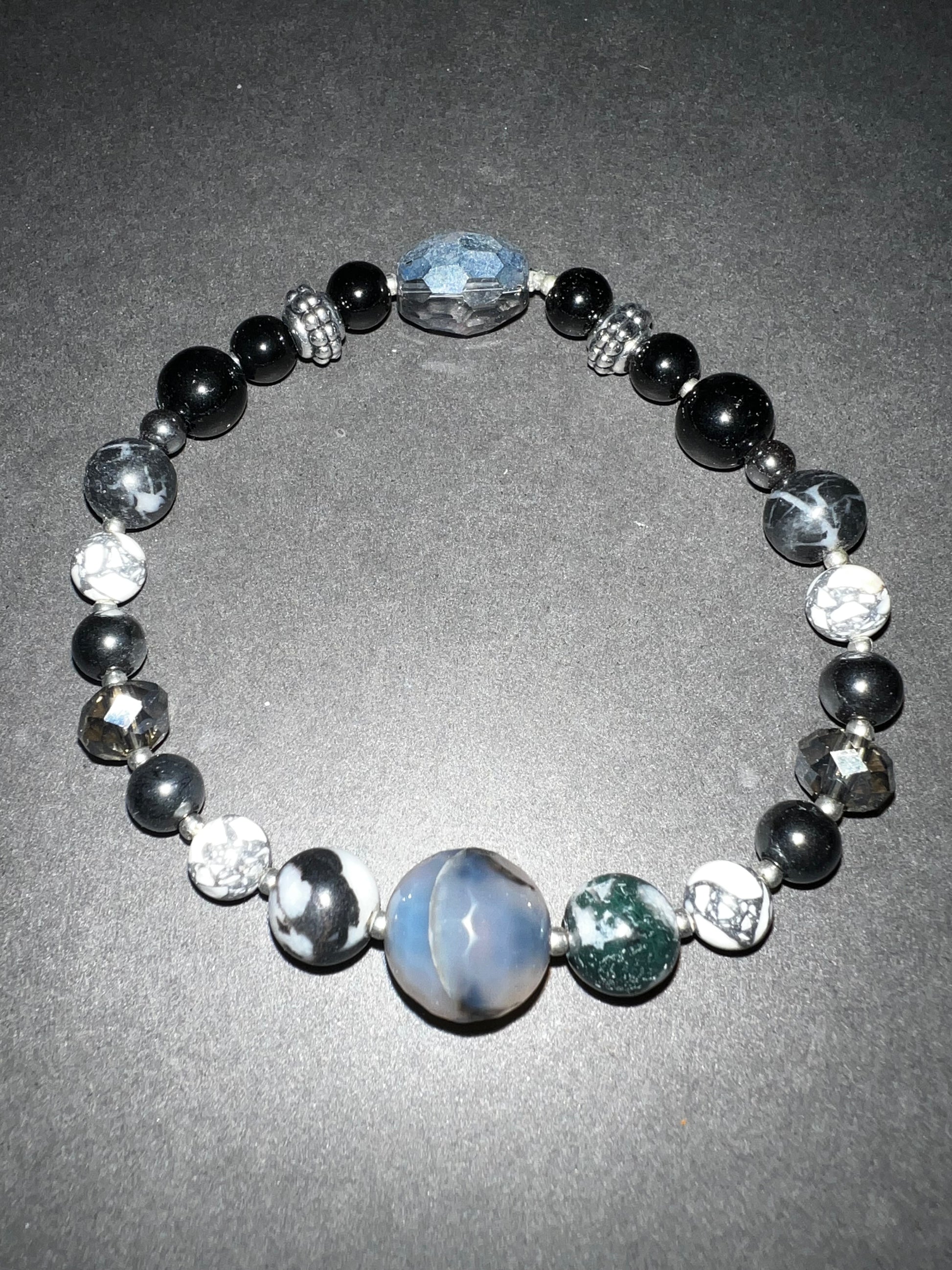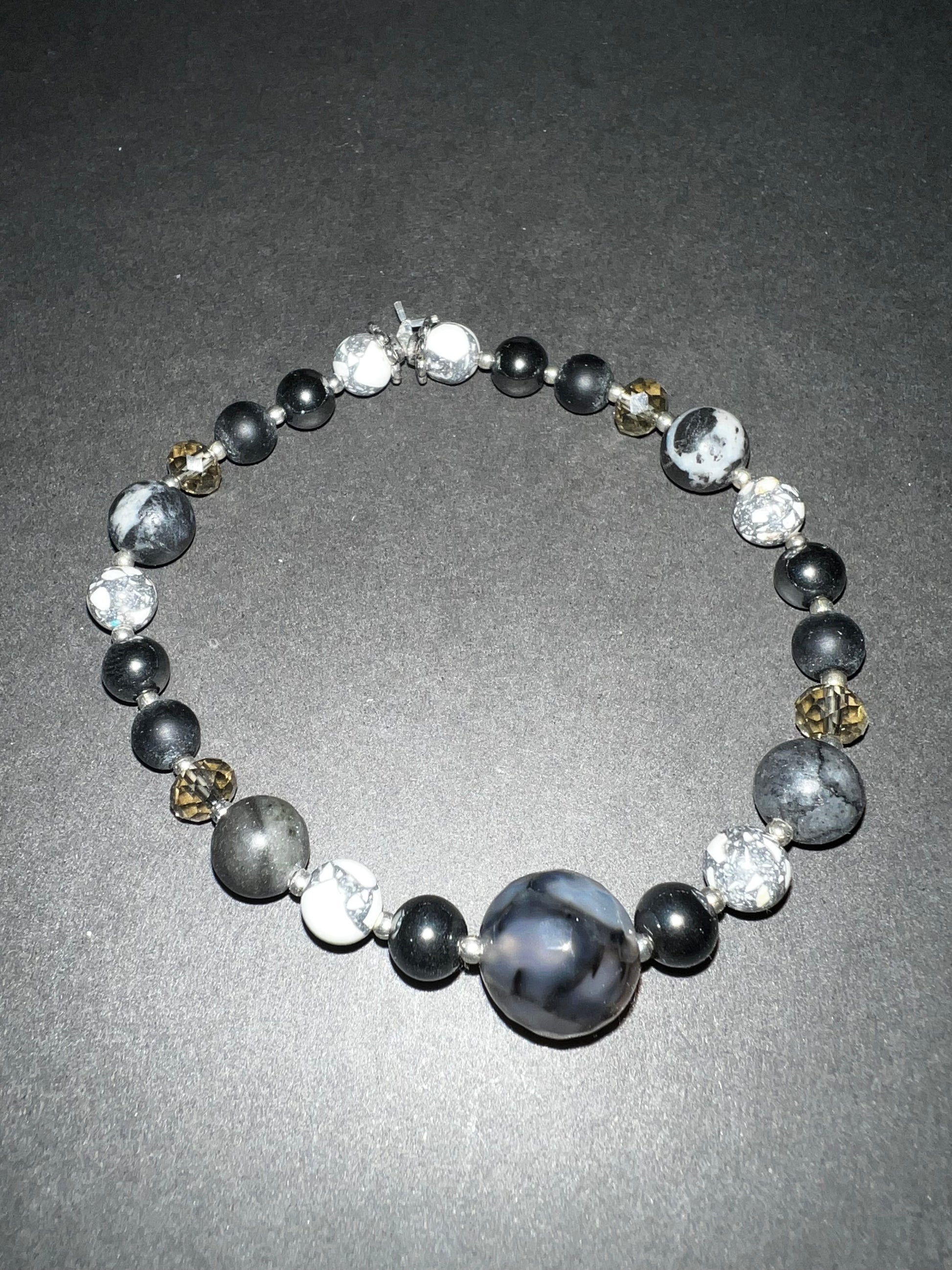 Labradorite, hematite, onyx, white howlite, glass with silver accents.