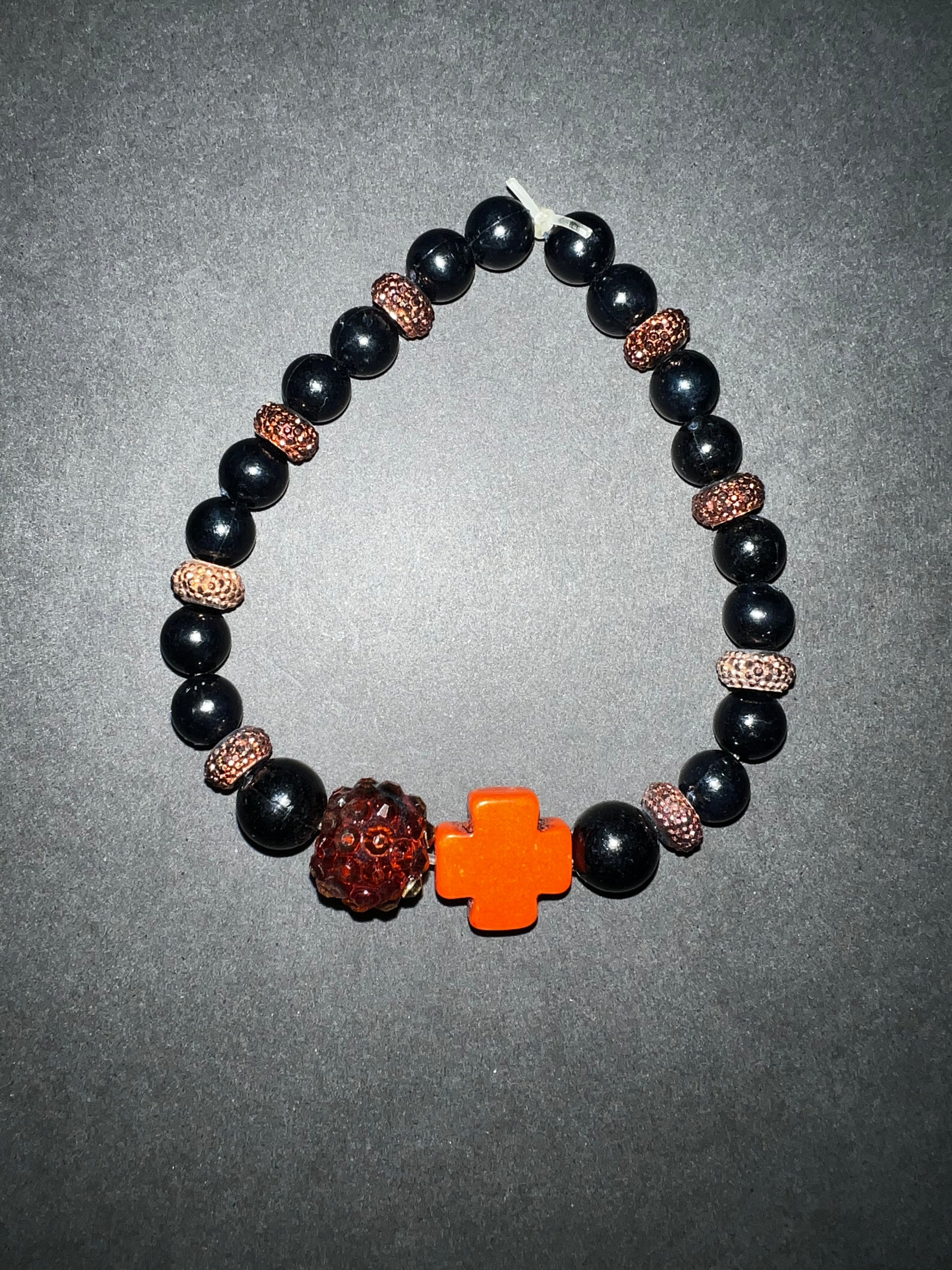 Black lava/plastic beads and orange Magnesite cross with orange & copper accents pieces. Set of 2.