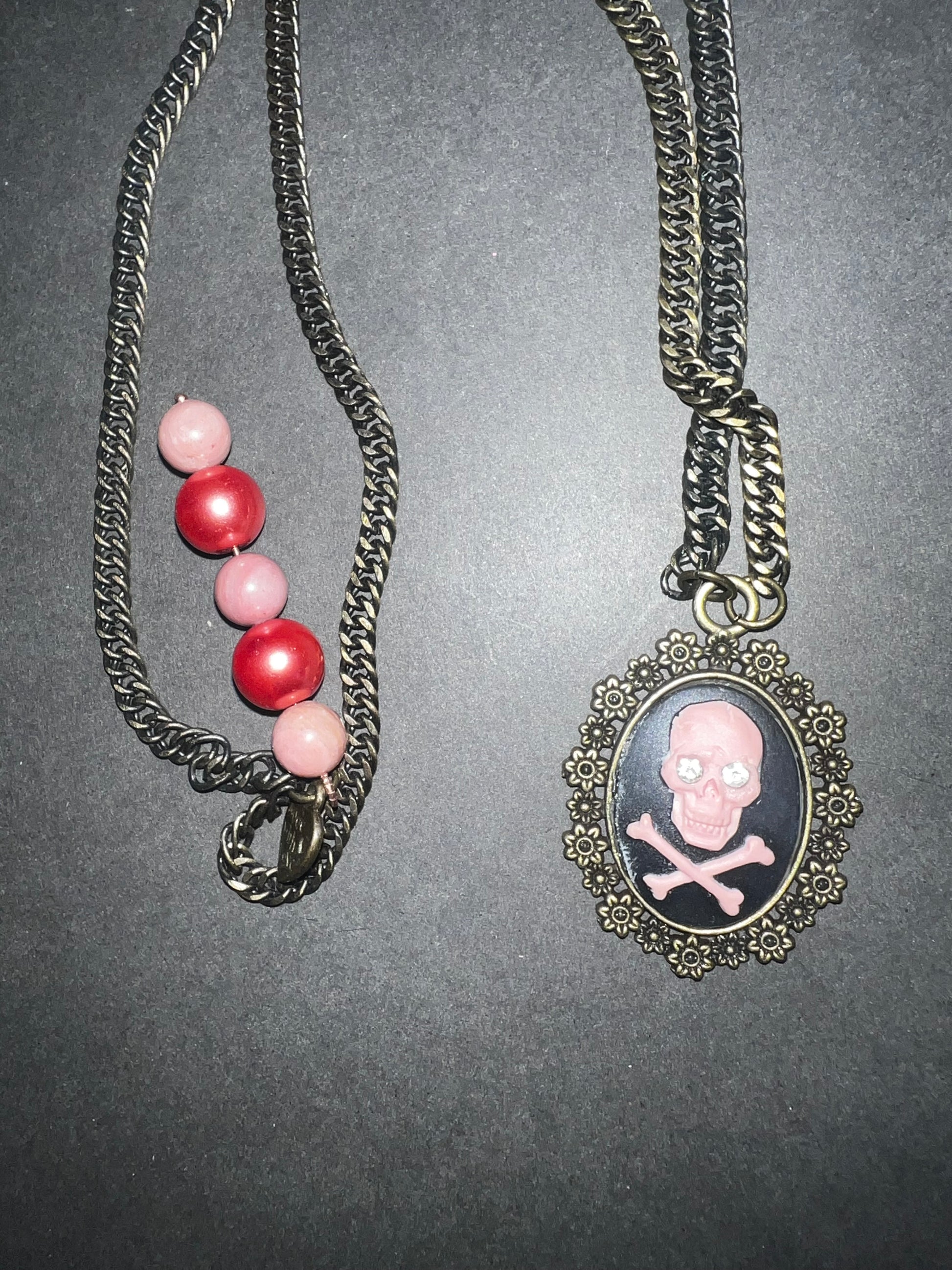 Bronze chain with pink and black skull charm and bead accent. No clasp, but can add if you prefer.