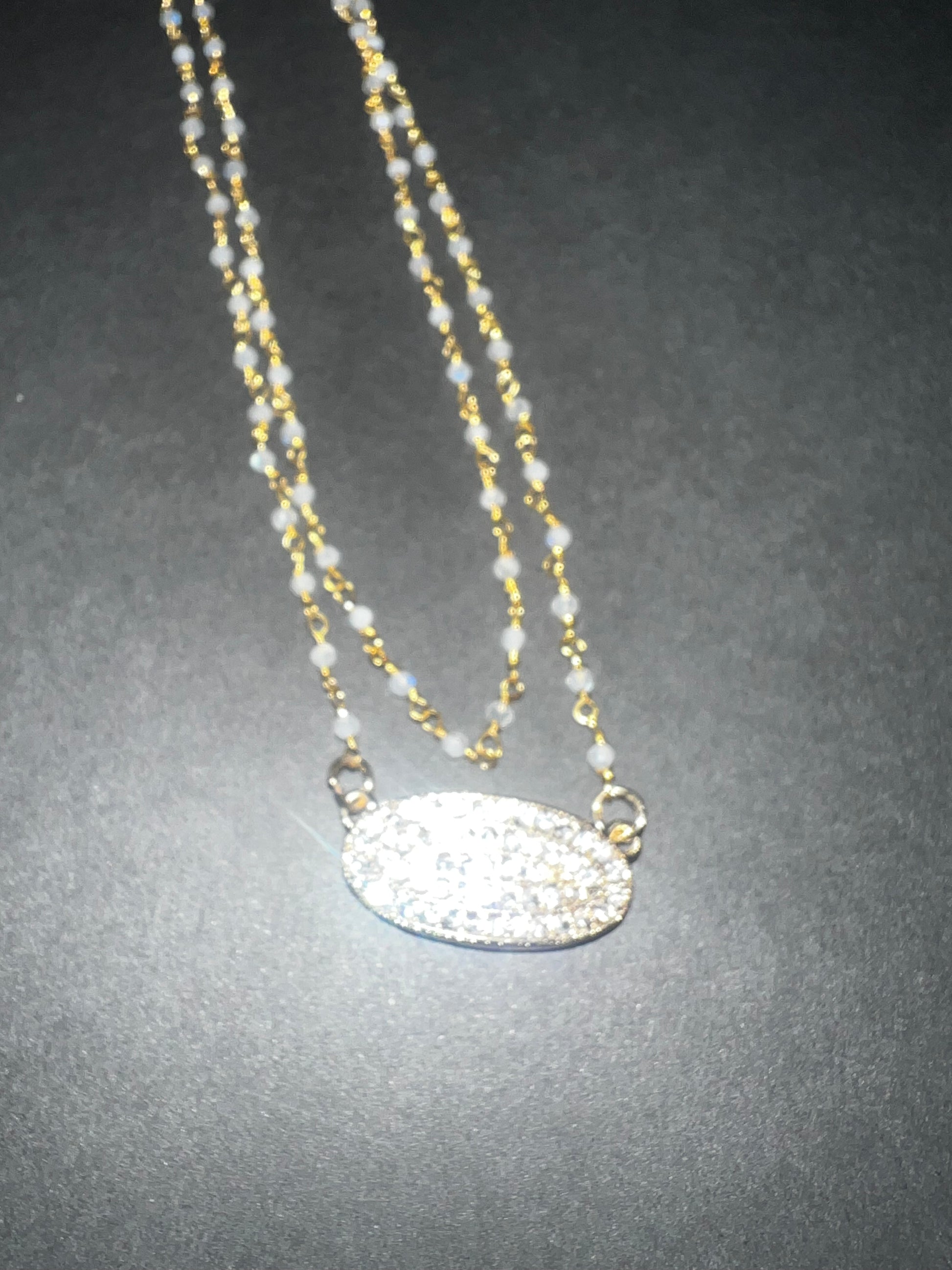Gold plated wire with white quartz beading prayer beads. Attached is faux diamond charm. Necklace comes with a clasp.