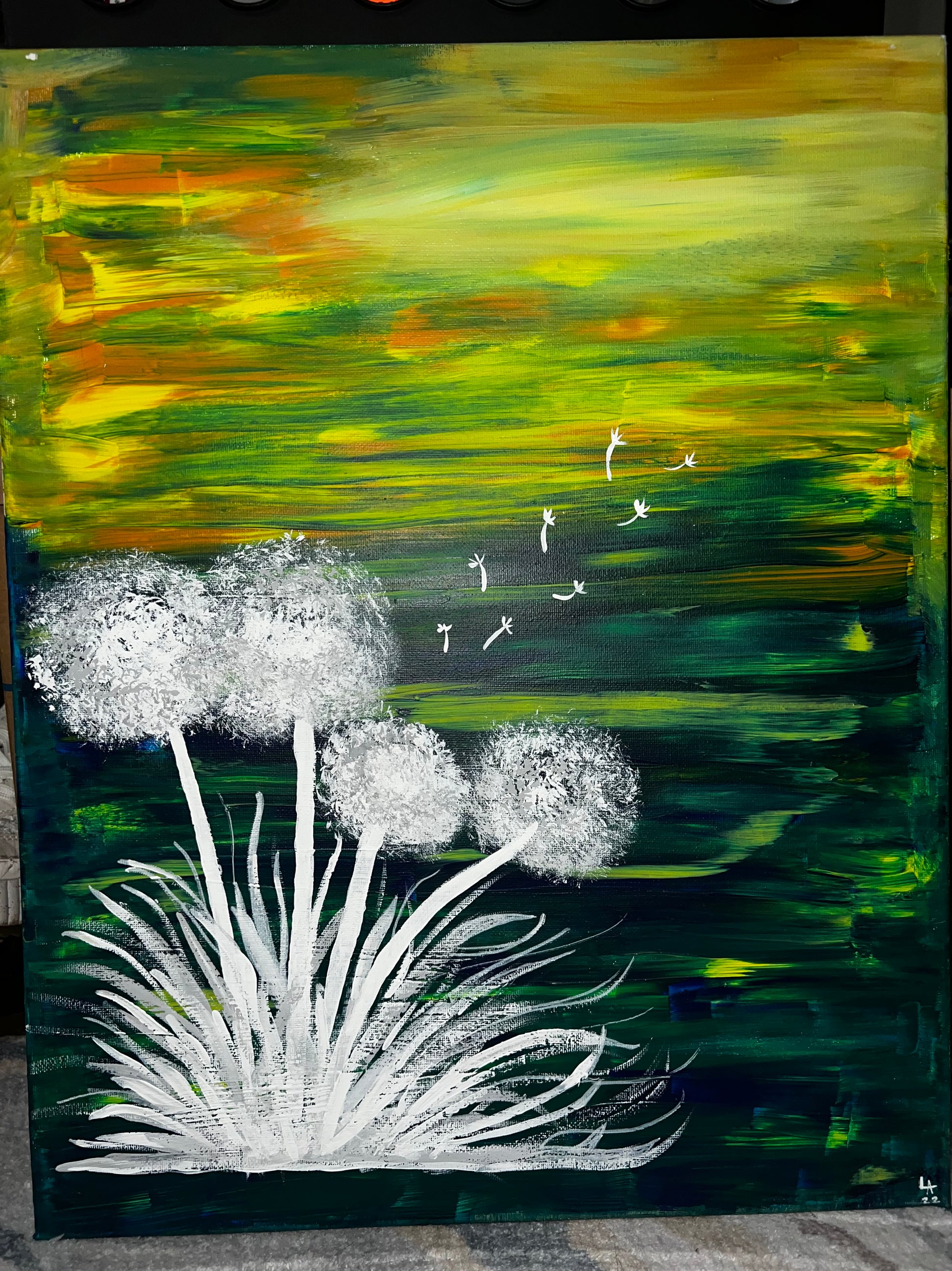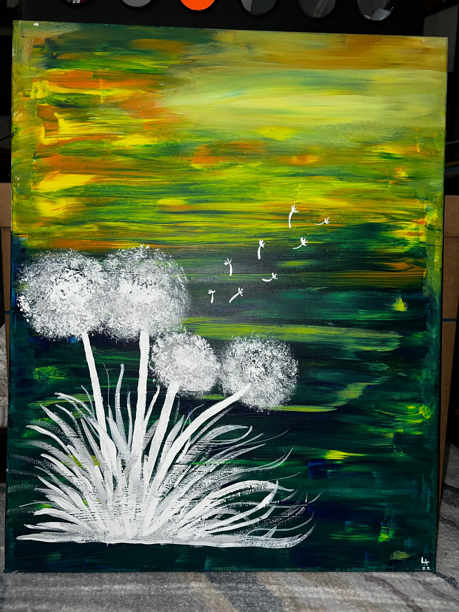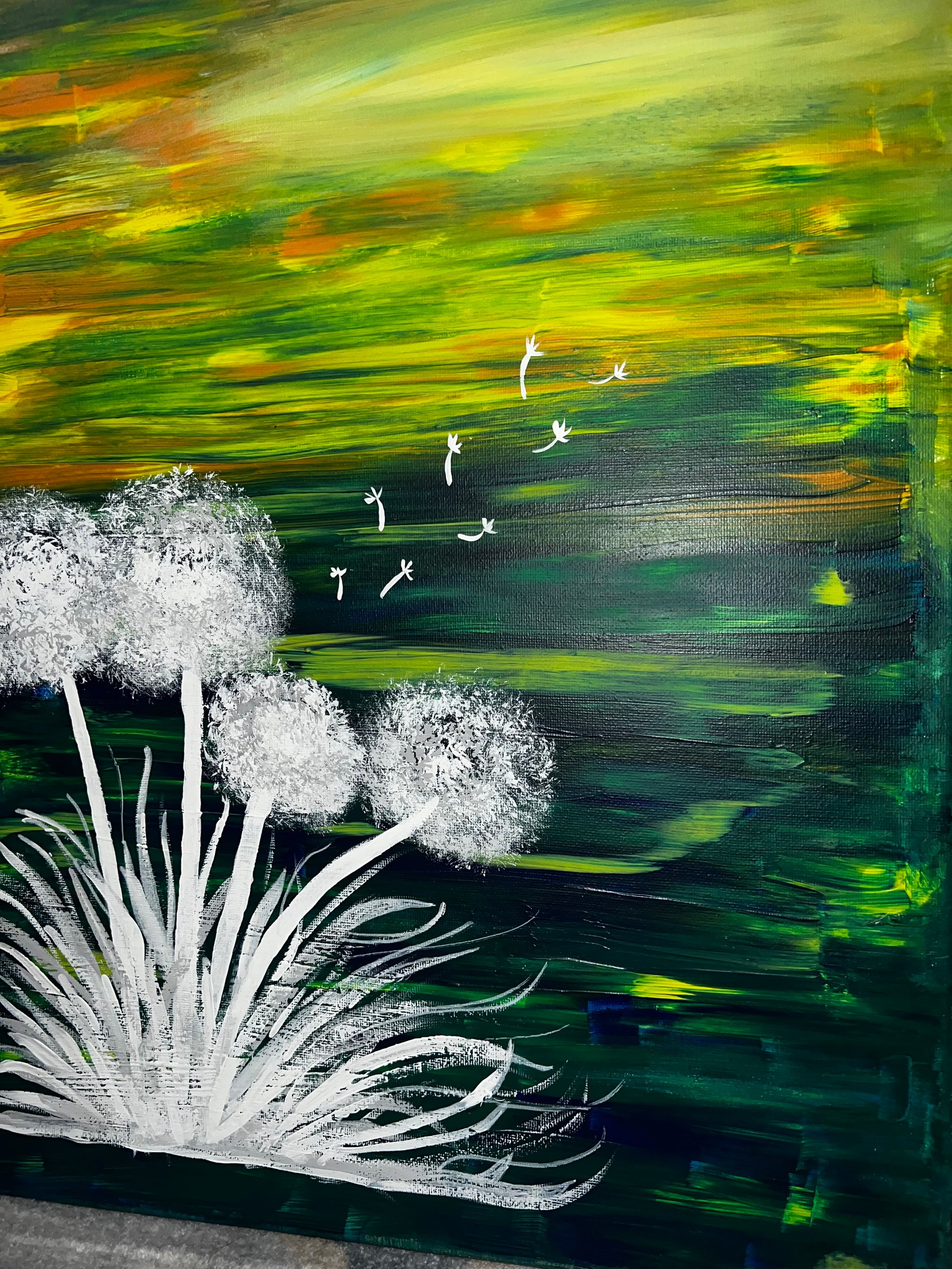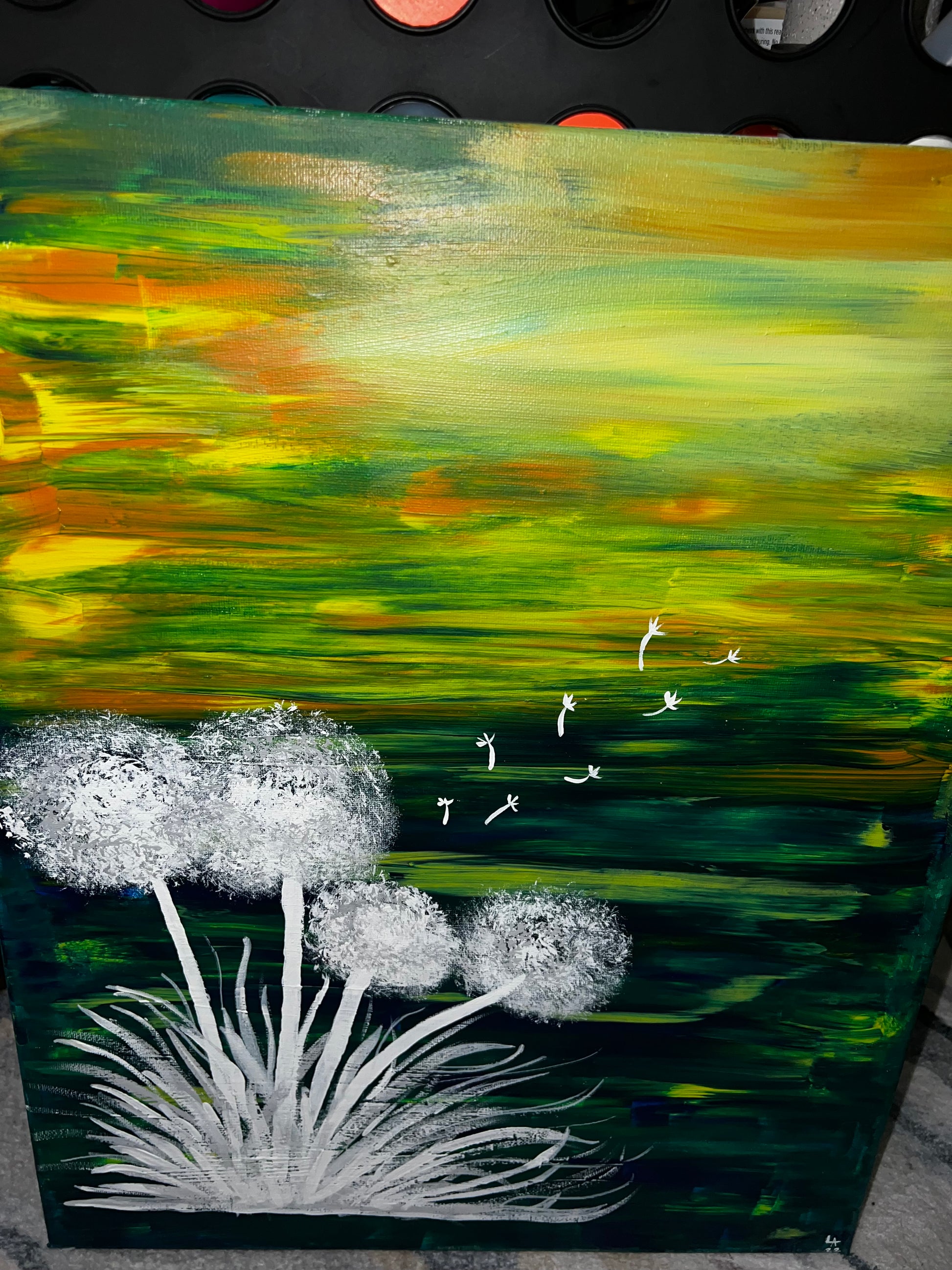 White Dandelions painted on multicolored background.