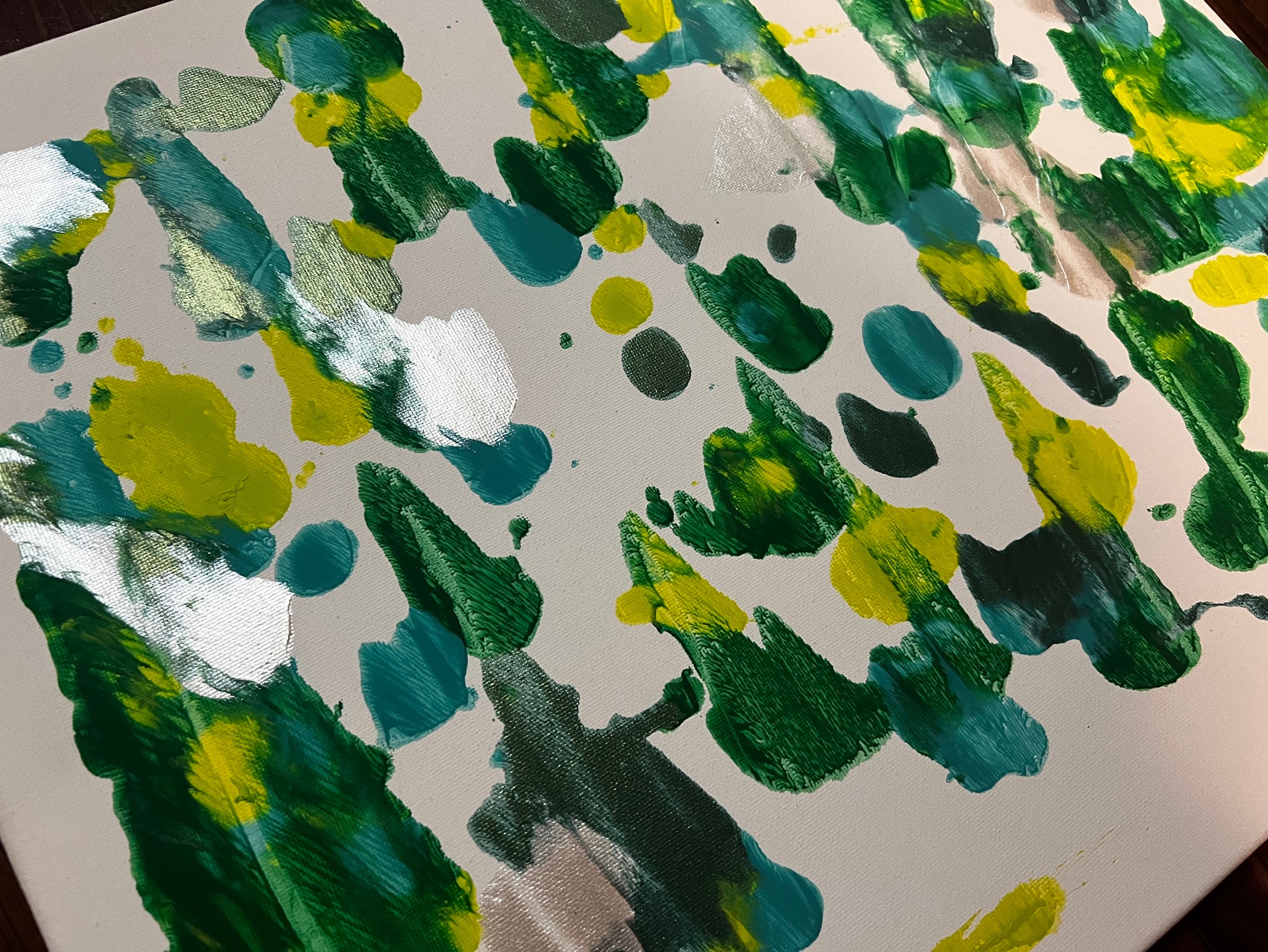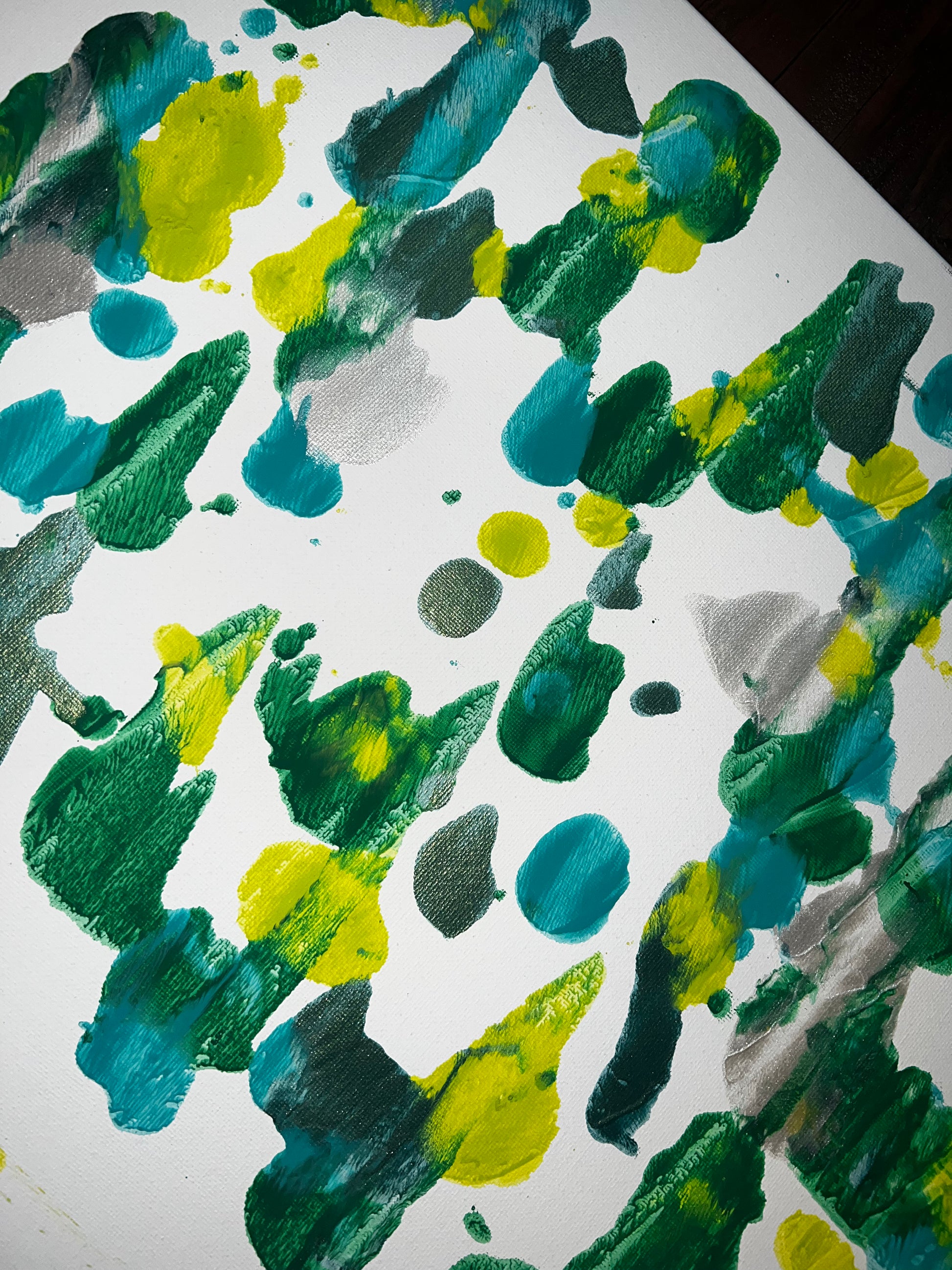 Shades of blue and green with silver paints brayed on a white canvas. 16”x20”