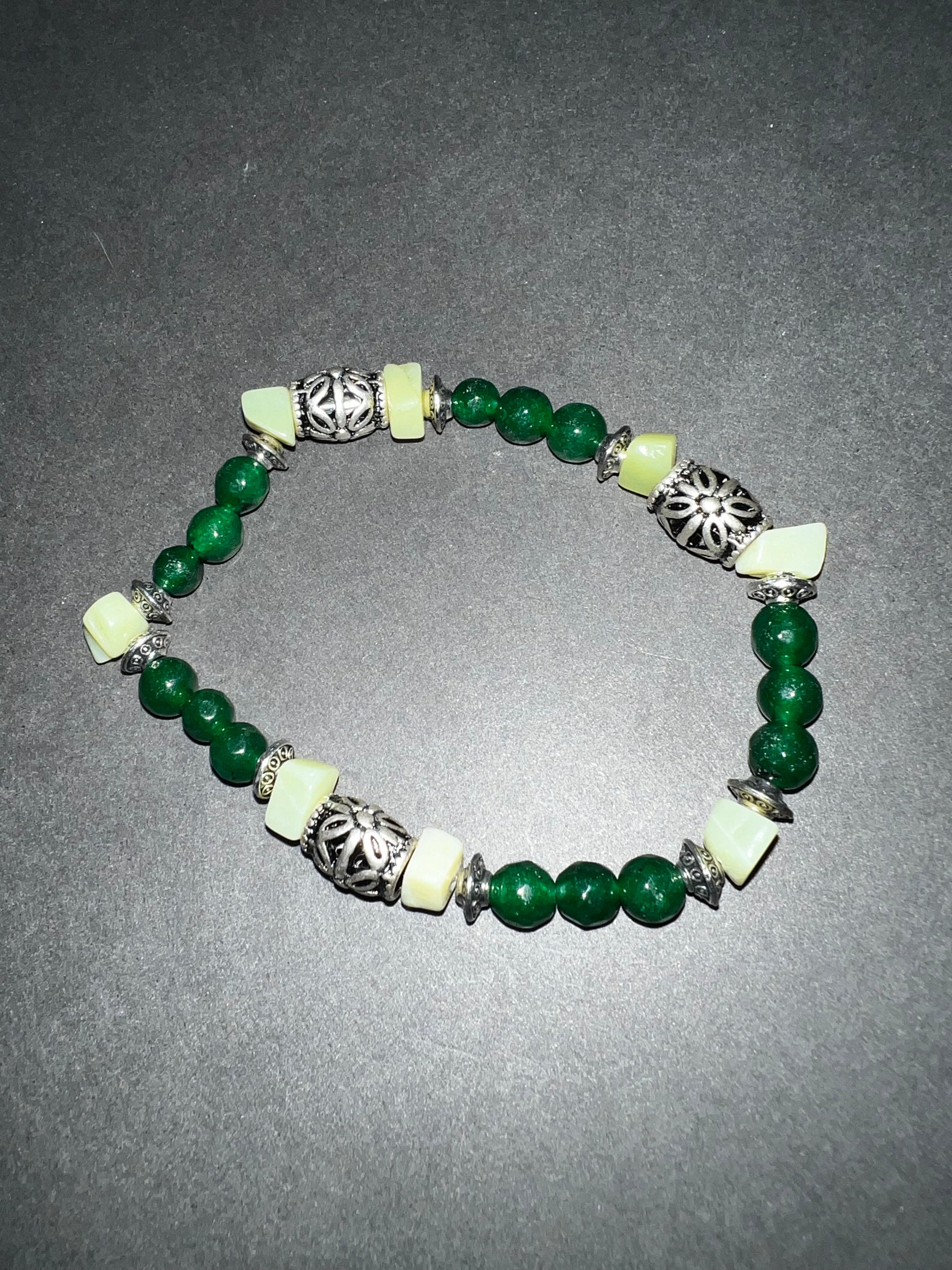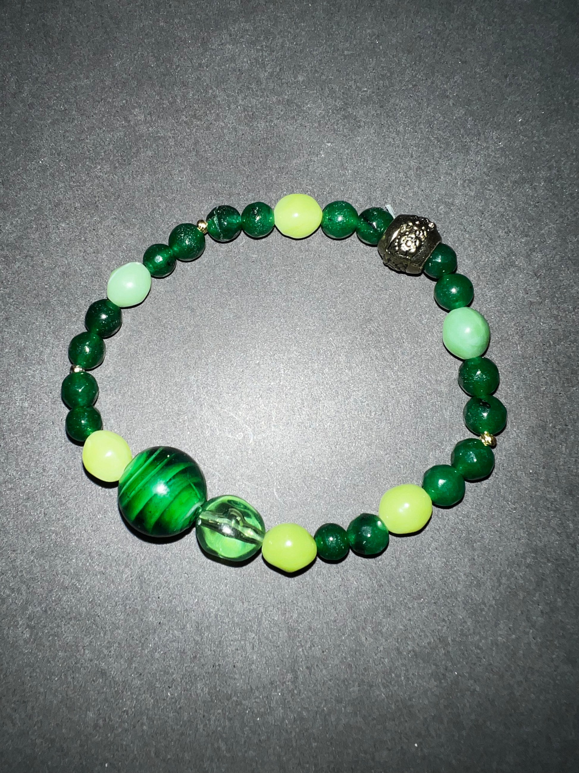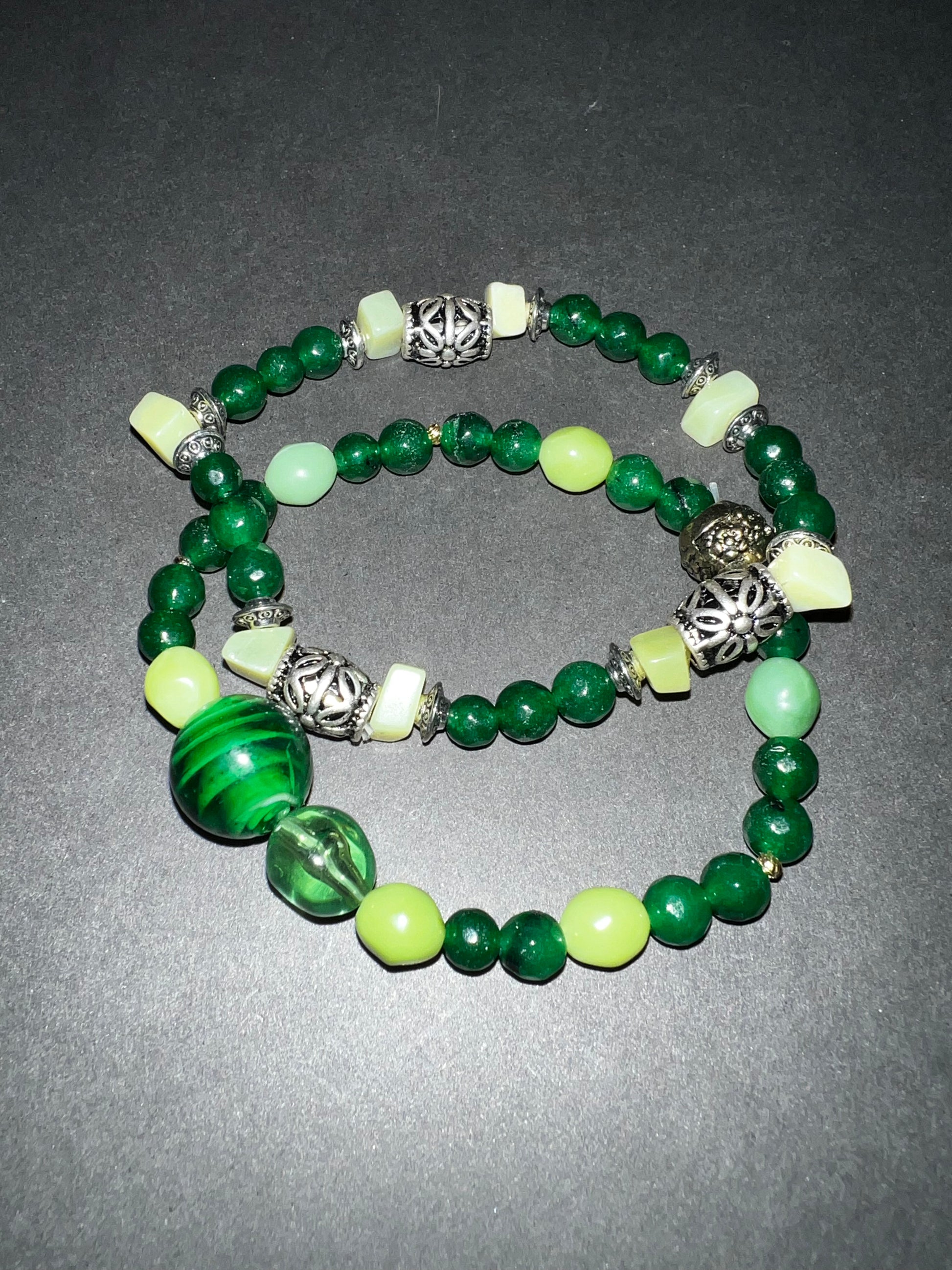 Two piece set of lucky jade bracelets, one has silver accents and the other gold. Also has green glass beads accent filler beads as well.